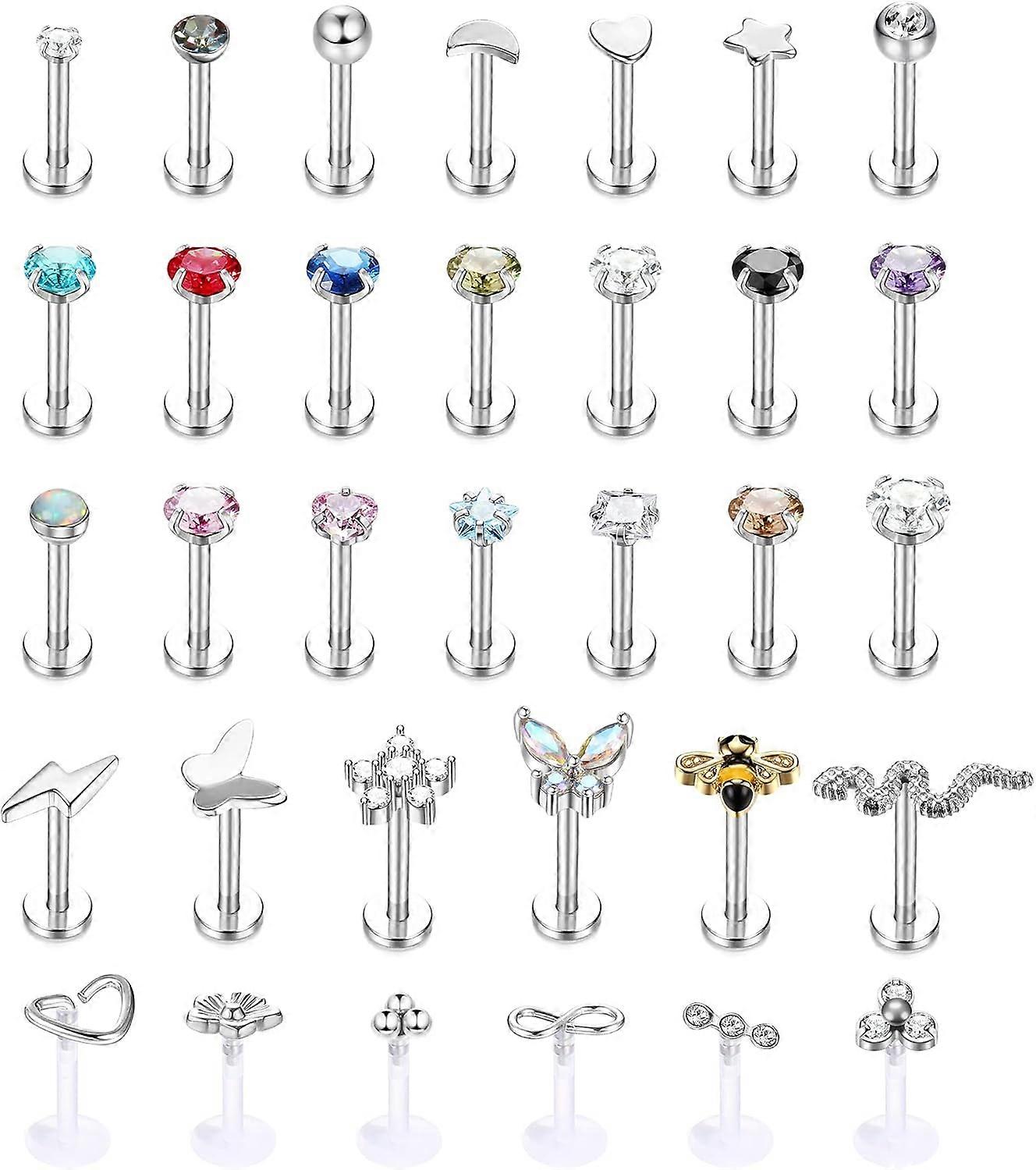 <p>Multiple Uses Can be used as ashley piercing, medusa piercing jewelry, monroe piercing jewelry, Madonna piercing jewelry, labret piercing jewelry, tragus stud earrings, helix piercing jewelry, forward helix piercing jewelry, cartilage earrings, conch piercing jewelry</p> <p>Quality High polished smooth surface and hypoallergenic material prevents skin damage and makes healing process comfortable and painless</p> <p>Lip Ring Set 33pcs lip piercing with internally threaded screw tops, bee lip ring, butterfly lip ring, flower lip ring, snake lip ring, etc, exquisite and cute, perfect lip jewelry for women and men</p> <p>Measurements Gauge Size: 16G (1.2mm). Bar Length: 8mm (5/16")</p> <p>Material Stainless steel lip piercing jewelry is very strong, provides lasting color retention and extremely easy to clean; Acrylic lip piercing jewelry is very comfortable and prevents damage and irritation to your skin</p>