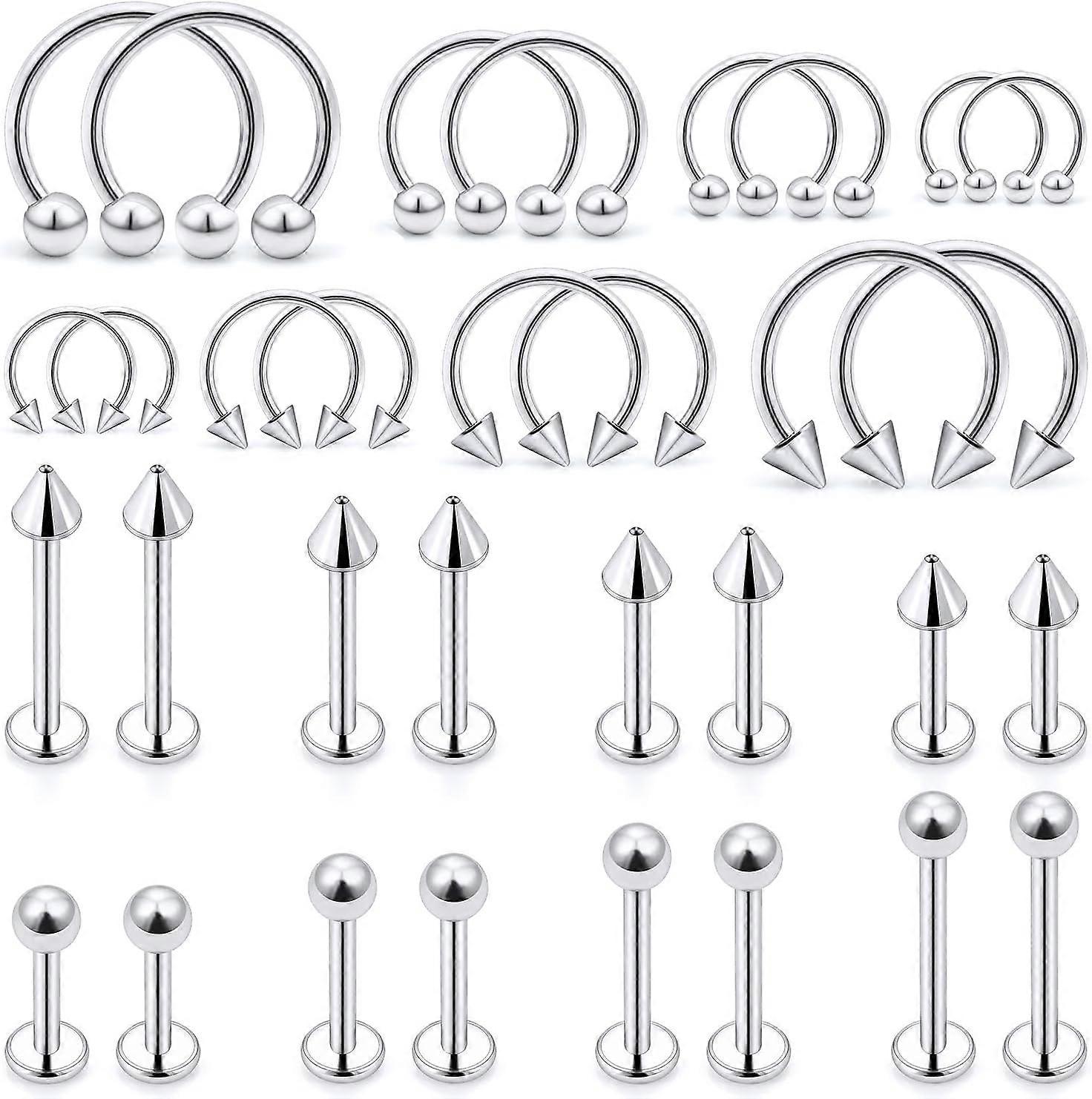 <p>SATISFACTION GUARANTEE & PACKAGE: Excellent Presale Consulting and Aftersale Customer Service. Coming with a Velvet Gift Bag. It's the Best Gift for Birthday, Christmas Day, Anniversary Day, Valentine's Day and more.</p> <p>Each Order Includes 16Pcs Labret Studs(LB) of 4 Different Size and 16Pcs Horseshoe Rings of 4 Different Size. Suit for Women and Men. Come with a Velvet Gift Bag, Absolutely a Great Choice for Gifts.</p> <p>Material: 316L Stainless Surgical Steel, Solid and Durable, Rarely Fade and Rust, Hypoallergenic; High Polished Surface, Very Smooth to Wear, Extremely Easy to Clean.</p> <p>MULTIPLE APPLICATION: These Piercing Jewelry Can be Use as Lip Rings, Labret Jewelry, Medusa Piercing Jewelry, Monroe Piercing Jewelry, Ashley Piercing Lip Jewelry, Smiley Piercing Jewelry, Nose Septum Rings, Tragus Earring, Triple Helix Earrings, Daith Piercing Jewelry, Eyebrow Rings and Other Body Piercing Jewelry.</p> <p>Thickness: 16G (1.2mm); Ball Size: 3mm; Spike Size: 3mm; Wearable Bar Length of Labret Studs: 6mm, 8mm, 10mm, 12mm; Inner Diameter of Horseshoe Rings: 6mm, 8mm, 10mm, 12mm; Color: Silvertone.</p>