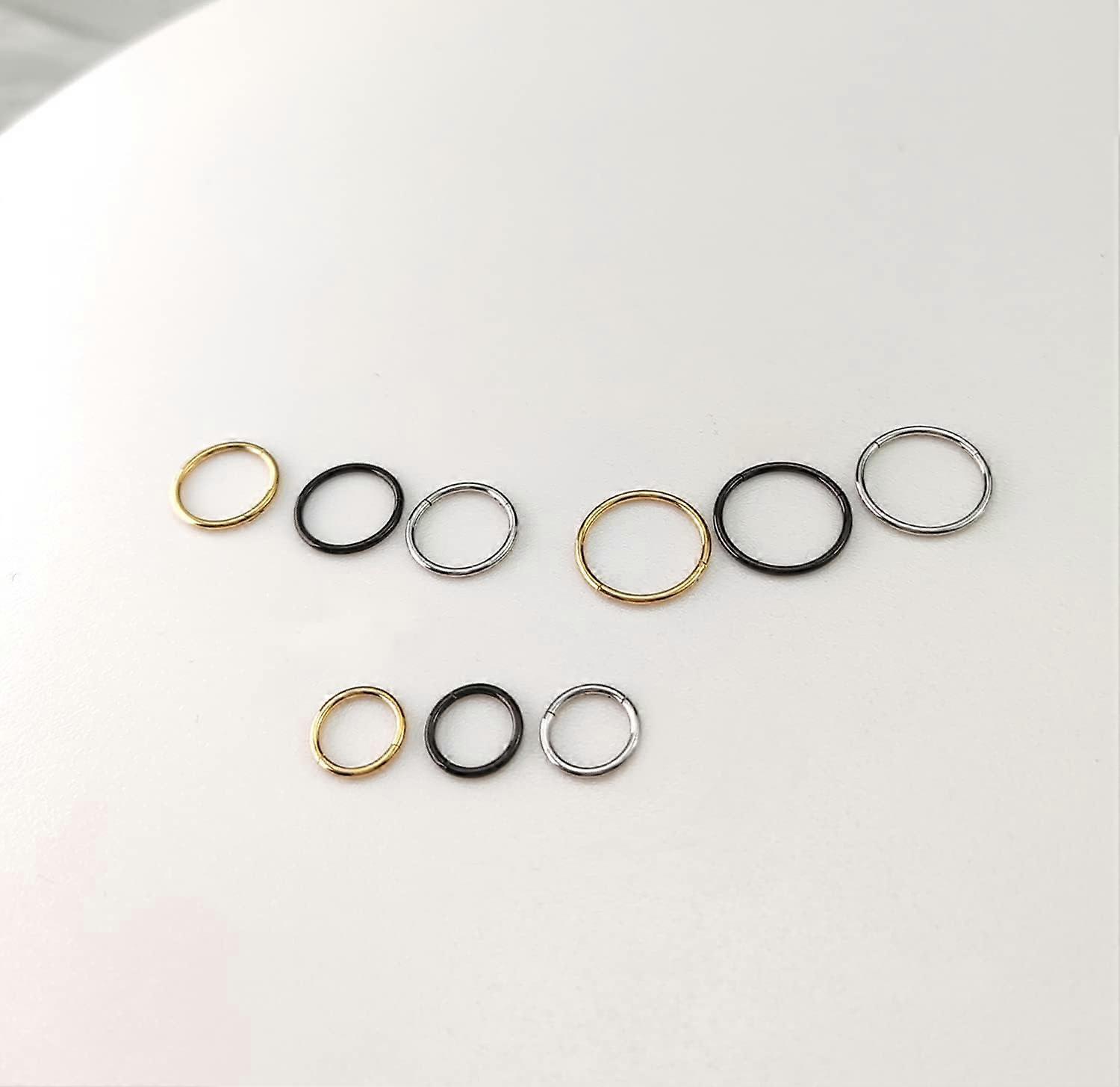 <p>Multiple Uses can be used as nose ring Septum Hoop Tragus Earrings Helix Cartilage Daith Rook Piercing and other body piercing jewelry.</p> <p> Hinged Clicker Hoop Material 316L surgical steel seamless design, high polish finish, smooth surface, never rust. It has a smooth closure that doesn't slipped or opened, It's still tight after longterm use.is the perfect body piercing jewelry. small nose hoop Leadfree, nickelfree for healing from a fresh nose piercing.</p> <p>20g Nose Hoops Size 20G (0.8 mm thick), inner diameter 8mm, Same size contains 3 colorsSilver/Gold/Black )to meet a variety of wearing effects, is the perfect body piercing jewelry.Choose The Proper Size According to Your Piercing Hole. Check Our Size Pictures and Product Description for More Detail About How to Choose the Right Size.</p> <p>The perfect gift This 20G small Nose Rings set is suitable for women men. Suitable for a variety of wears, it's the perfect gift for mom, wife, daughter, sister, friend, and more.</p> <p> 90Day Guarantee To ensure your complete satisfaction, we offer a 90day unconditional return service. All metals we use are leadfree, nickelfree and hypoallergenic. Excellent customer service. your satisfaction is 100% guaranteed.</p>