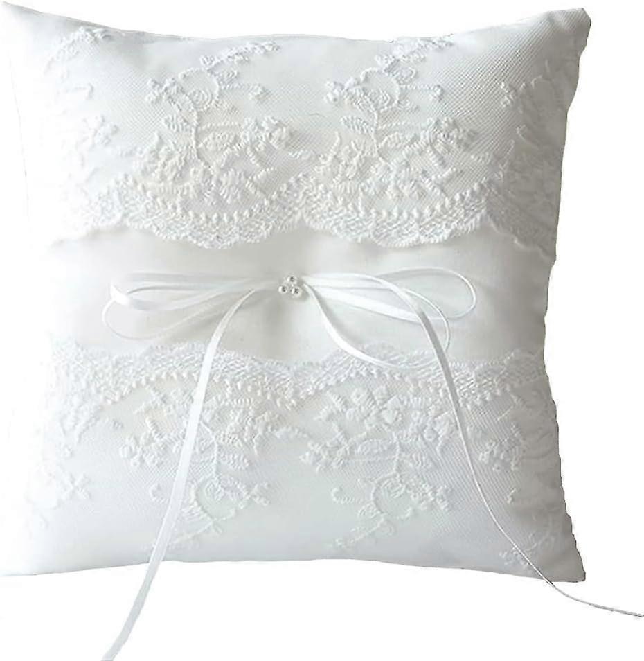 Wedding Ring Pillow Ivory Satin Ribbon Bow Pearls Lace Floral Embroidery Ring Bearer Cushion for Wedding Ceremony(8 inch) 2#white 1 Count