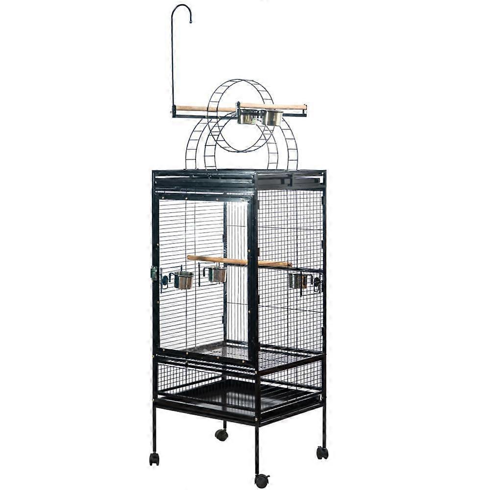 Durable Wrought Iron Construction Non-Toxic Powder-Coated Finish For Bird Safety Large Front Access Door Plus Two Side Access Doors Slide-Out Removable Top And Bottom Metal Trays For Easy Cleaning Pyramid Top Play Area With Ascent Ladder Flexible Ladder And Secured Locks For Added Safety Two Perches For Resting Five Food And Water Bowls Included Lockable Castor Wheels For Easy Movement Round Smooth-Edge Design Easy To Assemble Specifications