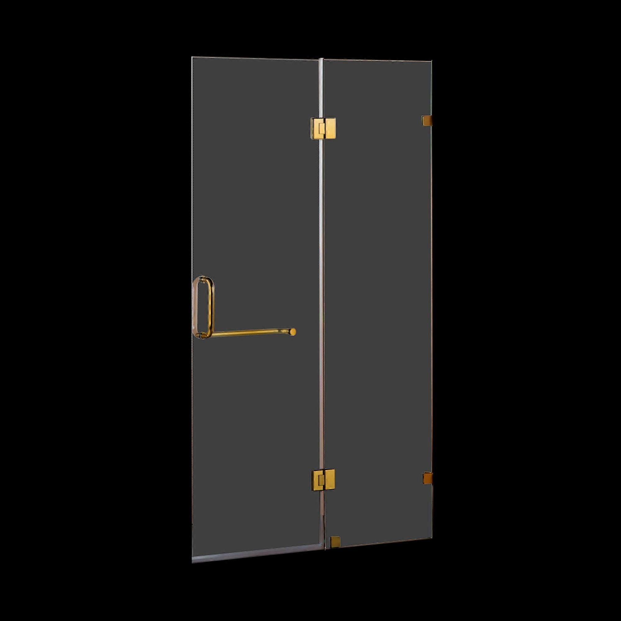 Designed To Meet Australian Standard As/Nzs 2208:1996 This Frameless Shower Screen Features 10Mm Tempered Safety Glass And Premium Gold-Finished Brass Hardware Including A Bold Square Handle And Corner Support Shelf.