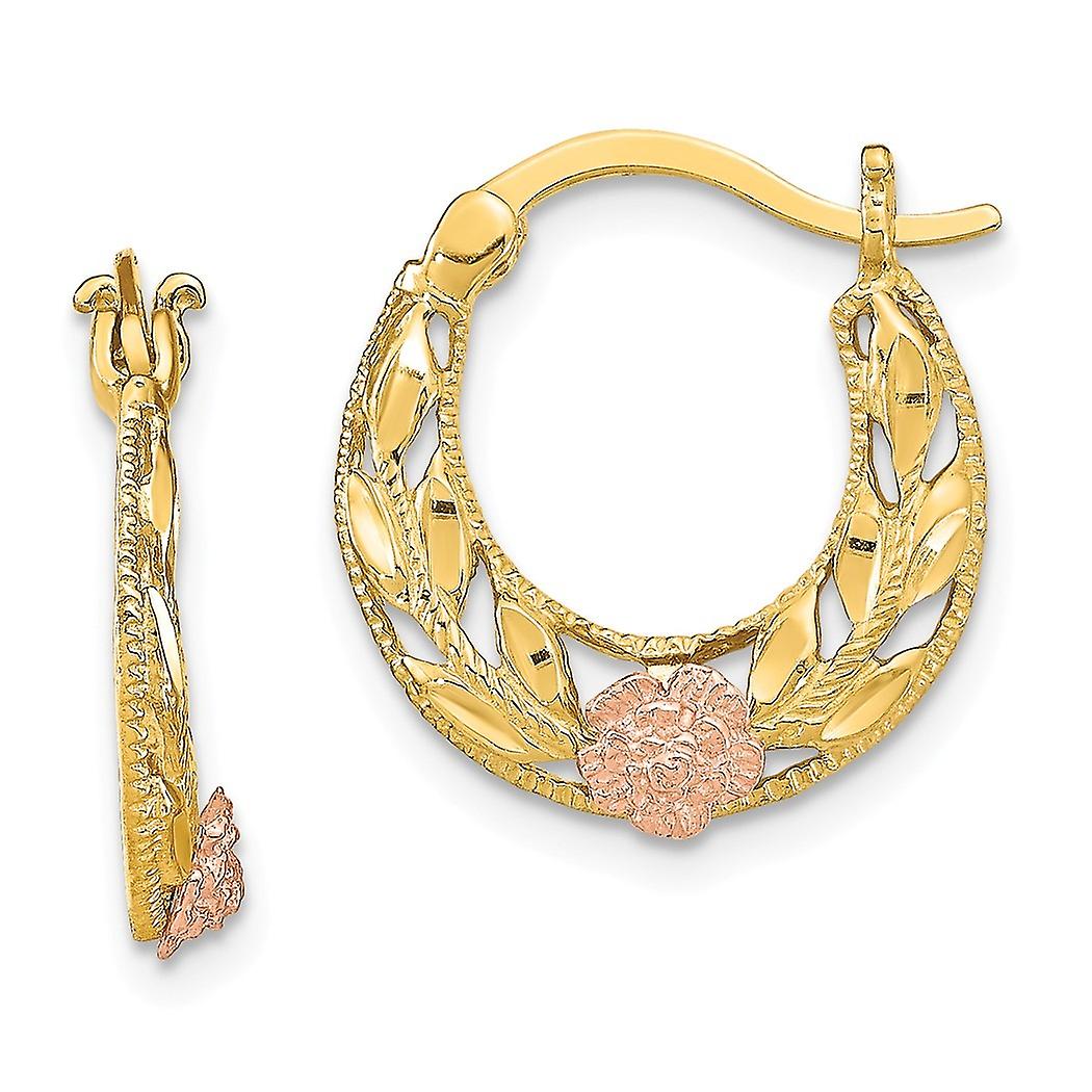 14k Two-tone Gold Cut-out Hoop Earrings With Pink Flower 17x16mm Wide Hoop Earring for Women