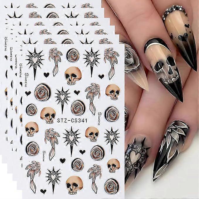 Halloween Skull Nail Art Stickers 6PCS 3D Retro Rose Flowers Heart Design Nail Decals Gothic Style Self-Adhesive Manicure Sliders Day of The Dead Nail