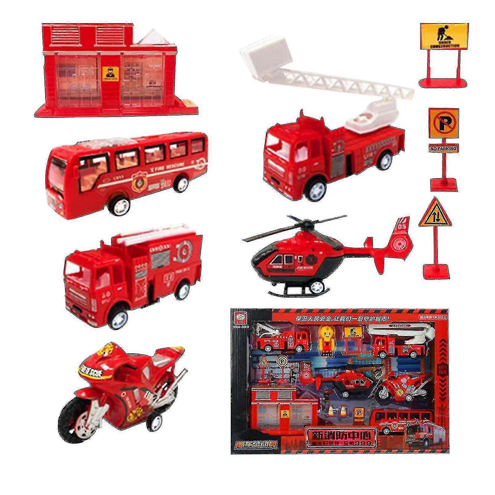 Fire Engines, Equipped With Extension Ladders, Motorcycles, Signs, Toys For Children Aged 3 And Above Feature A perfect fire truck toy set: it includes a fire truck, a fire workbench, a motorcycle, a fire bus, a helicopter, and some signs.<br> The rescue arm of the fire truck can and fall, and the fire workbench can rotate 360 degrees.<br> This series of molds simulate the scene of fire fighting work, bringing unusual experience to children.<br> Parents can accompany their children to simulate the scene of fire fighting work, enhance their feelings, and stimulate their children's understanding of fire fighting work.<br> for Kids: Your child can use these toys to play the role of fireman.<br> Children gain great satisfaction from this game because they see themselves as real fire-fighters.<br> Players of this game will see themselves as city heroes Using this vehicle bring lots of to kids, hence, it is one of the choicest gifts for kids.<br> Specification: Size:48*28*5cm Packet included: 1*FIRE ENGINE SET