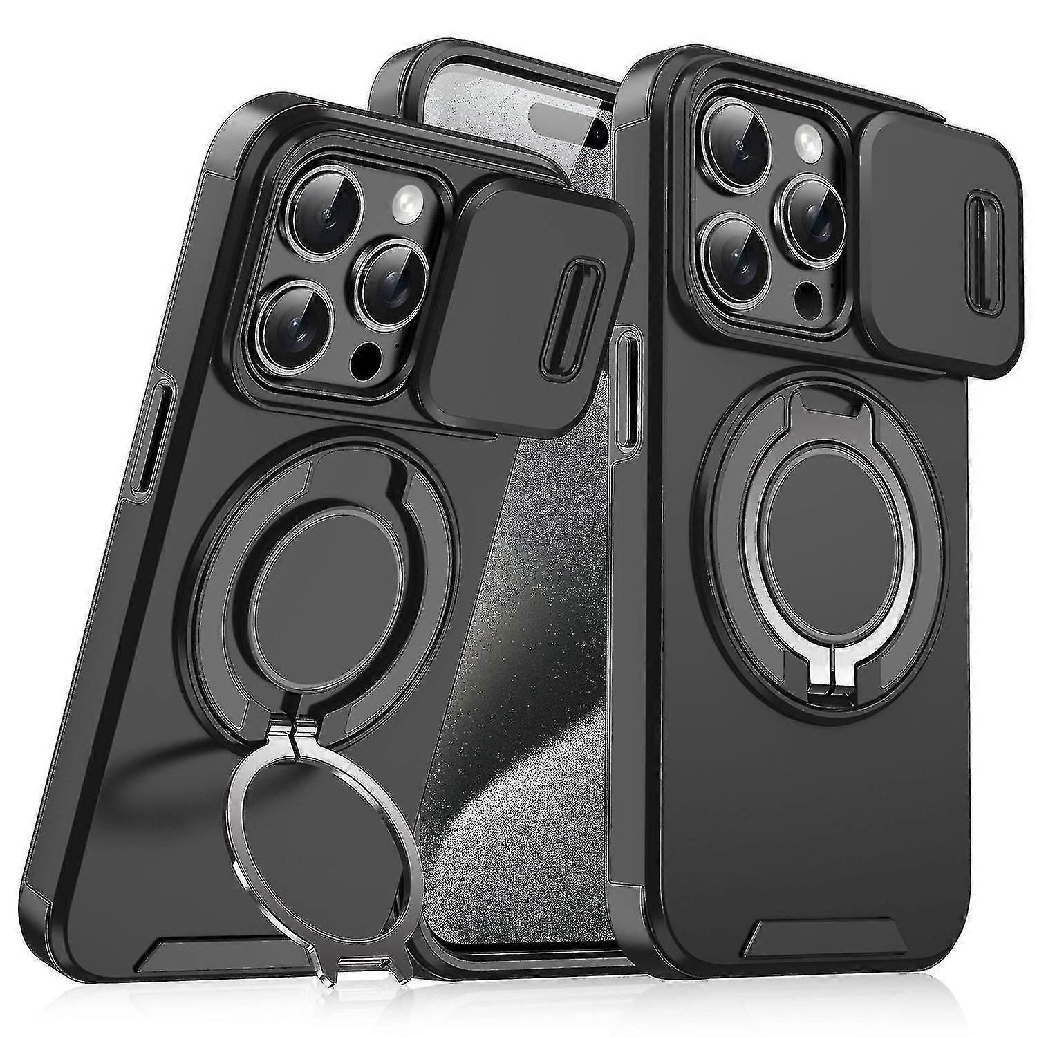 Magnetic iPhone 15 Pro Case with Kickstand, TPU and PC Build, Includes Camera Lens Slide Cover in Black