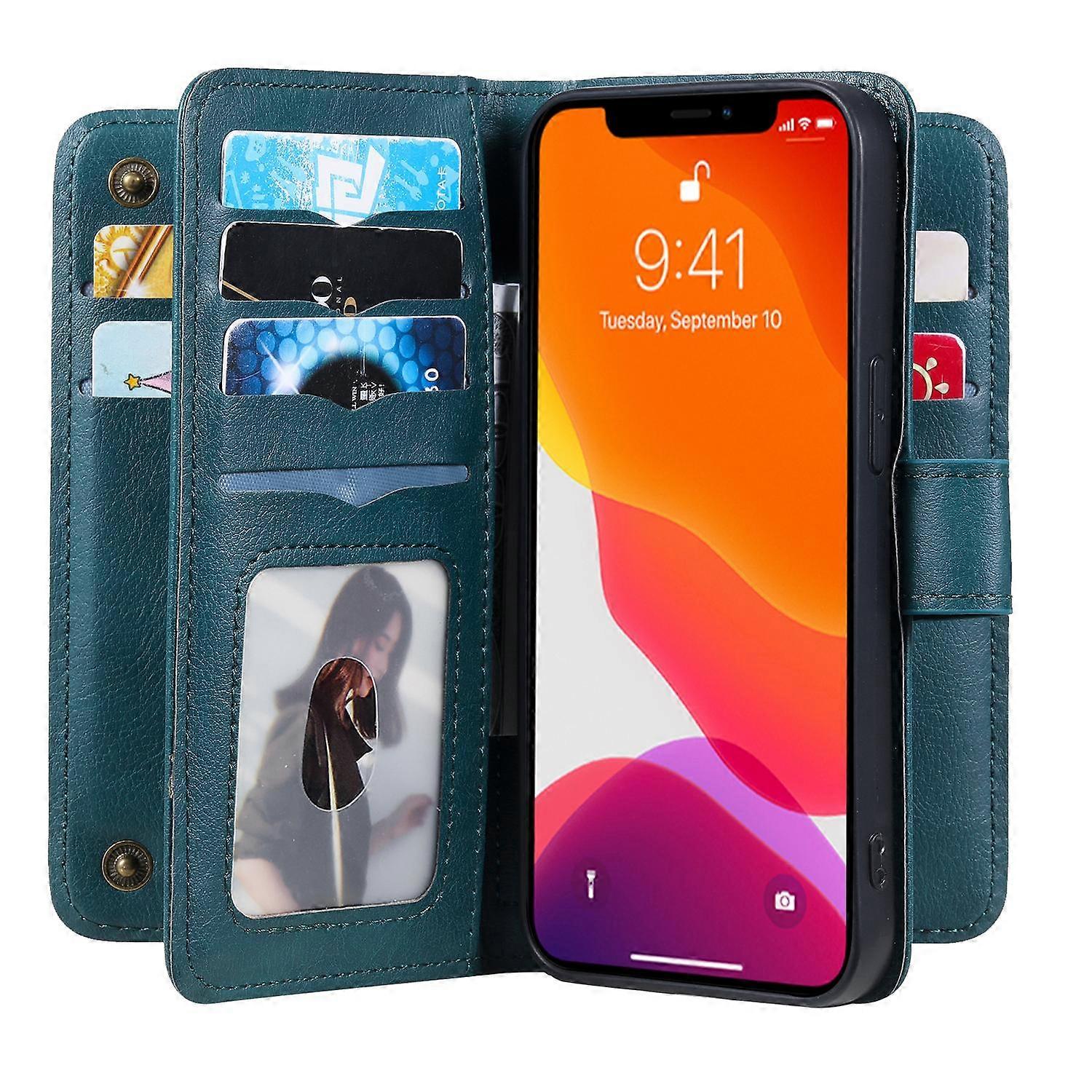 For iPhone 13 Leather Case with 10 Card Holder Phone Cover Stand - Dark Green
