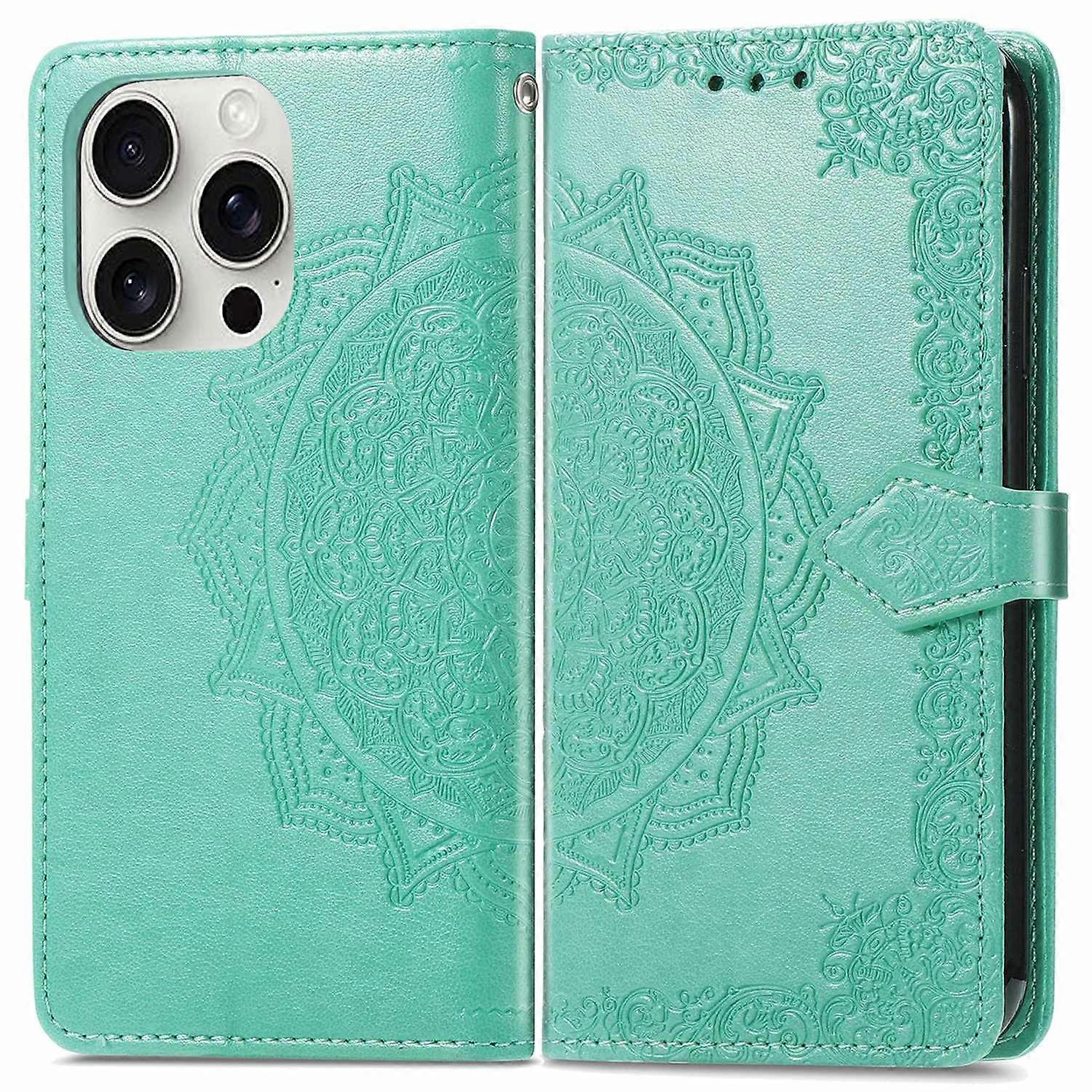 For iPhone 16 Pro Case Card Holder Cash Slots Leather Phone Cover Embossed Mandala Pattern - Mint Gr