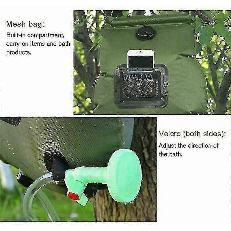 Specifications: Material: PVC Color: Army Green Capacity: 20L Size: 45x50CM pandgt Hose length: 50 cm (including nozzle) Weight: 430 g Packaging: bag Contents included: andlt pandgt 1 bath bag 1 PVC pipe 1 shower head 1 mesh bag for storage