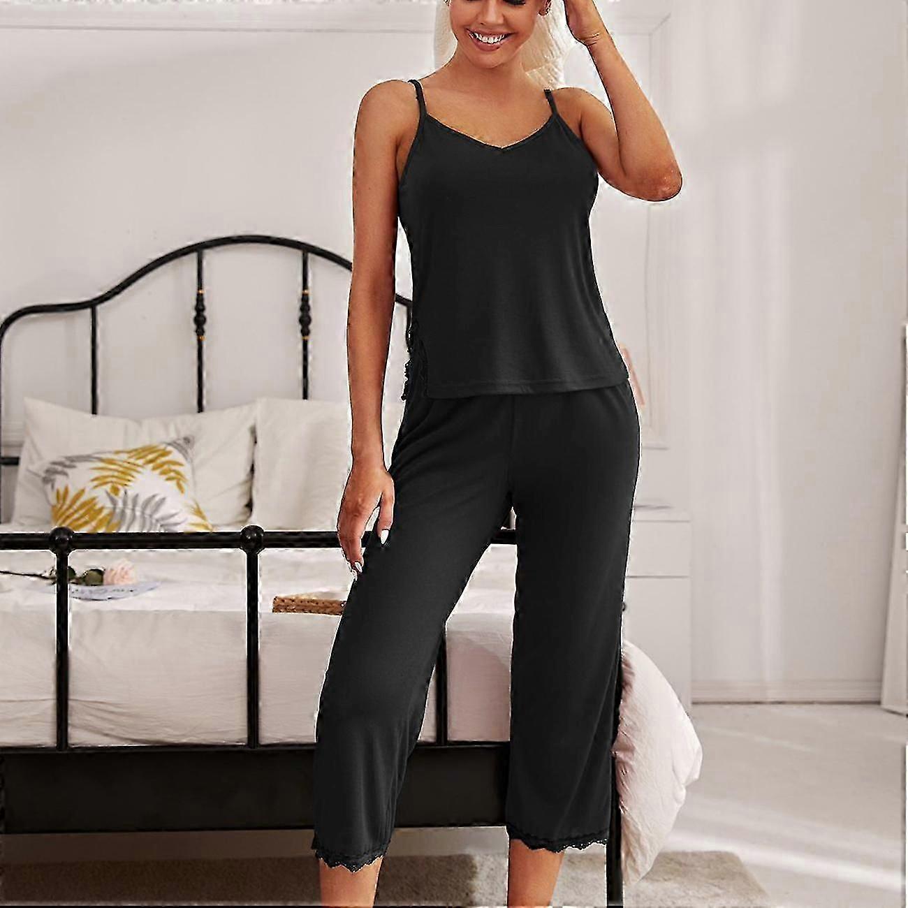 Womens Sleeping Suits 2 Pieces Pajamas Slip Tank Top Lace Trim Cropped Pants Comfy Sleep Lounge Wear Night Clothes Summer Casual Home Wear