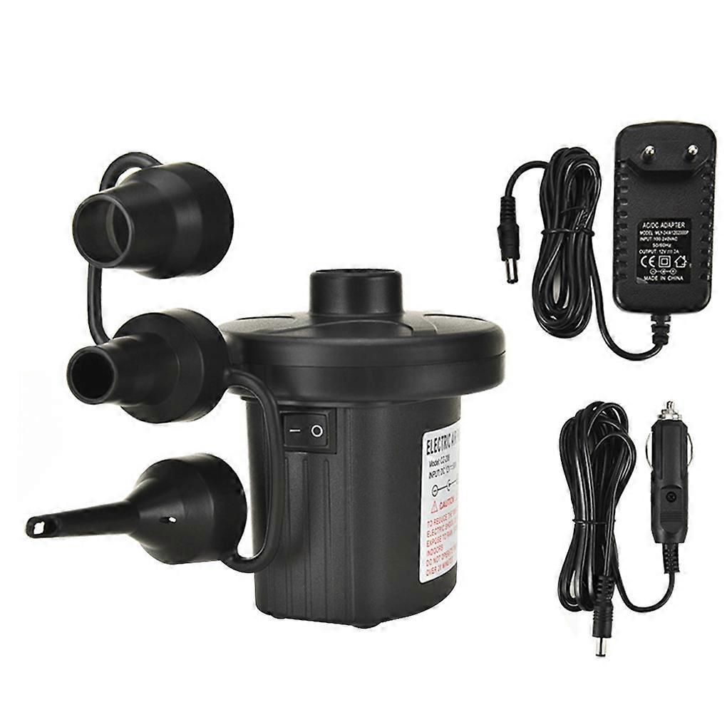 Description: Equipped with a powerful motor, this air pump for pool inflatables can quickly inflate and deflate air mattresses, inflatable boats, rafts, snow tubes and more, saving time and energy for other things. Moreover, compared with many traditional air pumps, this pump features two-sided cooler vents and one bottom cooler vent, ensuring its performance for long-term use while quickly inflating and deflating inflatables(Max for Airflow:420L/Min). This inflatable pump includes a lighter connector (12V) for car use and an adapter (100-240V) for household use. The air pump can not only be used for indoor inflatables such as yoga balls and vacuum storage bags, but also suitable for many others for outdoor activities. This kind of air bed pump features three functional nozzles from which users can choose the appropriate one in terms of the nozzle sizes of inflatables. It can inflate or deflate inflatables ranging from small swimming rings or inflatable toys to large snow tubes, inflatable boats and inflatable pools, practically meeting your diverse inflation and deflation needs. (NOTE: Please do not use this pump for high-pressure inflatables such as tires, balloons or basketballs) This electric pump can not only be used for inflation, but serves as a versatile deflation helper for inflatables. With two vents in one pump, no other tools are needed for inflating or deflating inflatables. To inflate or deflate the inflatables, simply install one nozzle on the inflation or deflation vent securely, then insert the pump in, and finally press the power button, making your life and work more convenient. The electric pump for inflatable pools is small and lightweight, making it easy to use and carry. With this labor-saving design, the inflatable pump can be easily carried for traveling, camping, vacation, beach parties and other outdoor activities without taking much space in the car. Specification: Material: ABS. Color: show as pictures. Size: 11.7*10*11.5CM. Cable length: 1.8m. Voltage: 110-240V. Power: 50W. Note: Due to the light and screen difference, the item's color may be slightly different from the pictures. Please allow a slight deviation for the measurement data and make sure you do not mind before ordering. Package included: 1x air pump. 1x household adapter. 1x car power adapter.