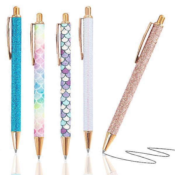 Metal Retractable Ballpoint Pens Set, 5 Pcs Metal Glitter Black Ink Pens, 1.0mm Comfortable Writing Pen, Mermaid Wave Motif Pretty Pen for Women