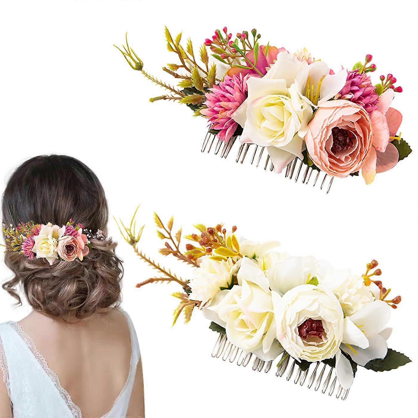 2pcs Artificial Rose Metal Hair Comb Side Comb Flower Decoration for Women Flower Girl Bride Bridesmaid