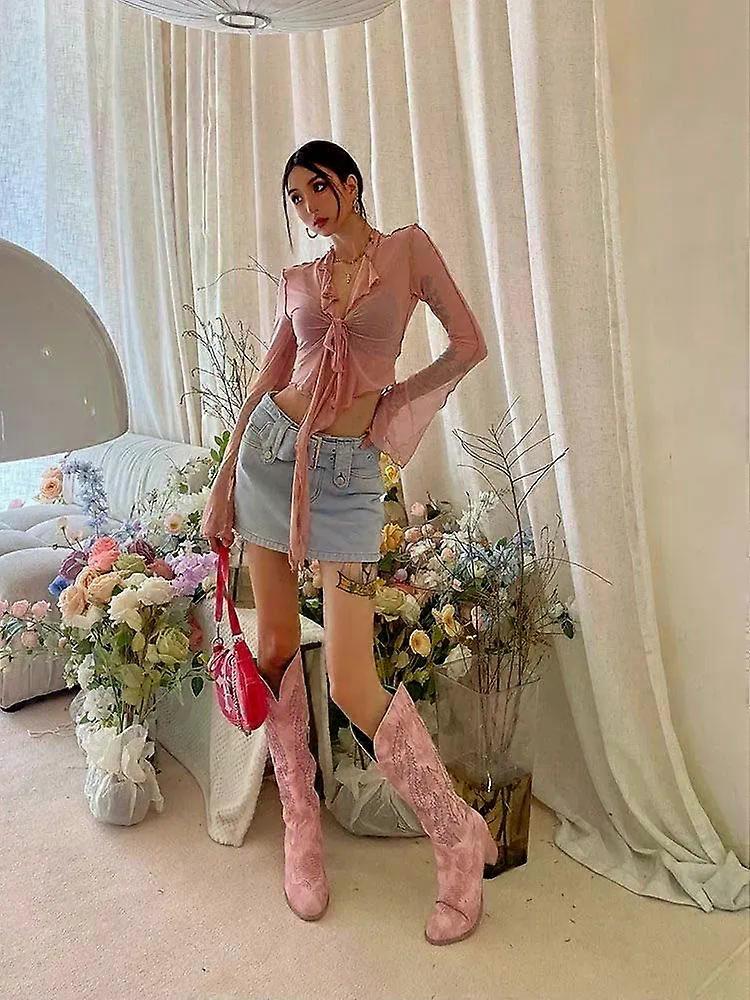Long Flare Sleeve Blouses for Women Lace-up Mesh Sexy Sweet Hot Girls Korean Fashion Style All-match Solid Design Elegant Casual