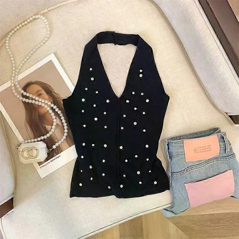 New White Rhinestone Knitted Tank Top Casual Halter Neck Sleeveless Tank Top For Summer Women s Clothing Crop Top Camis