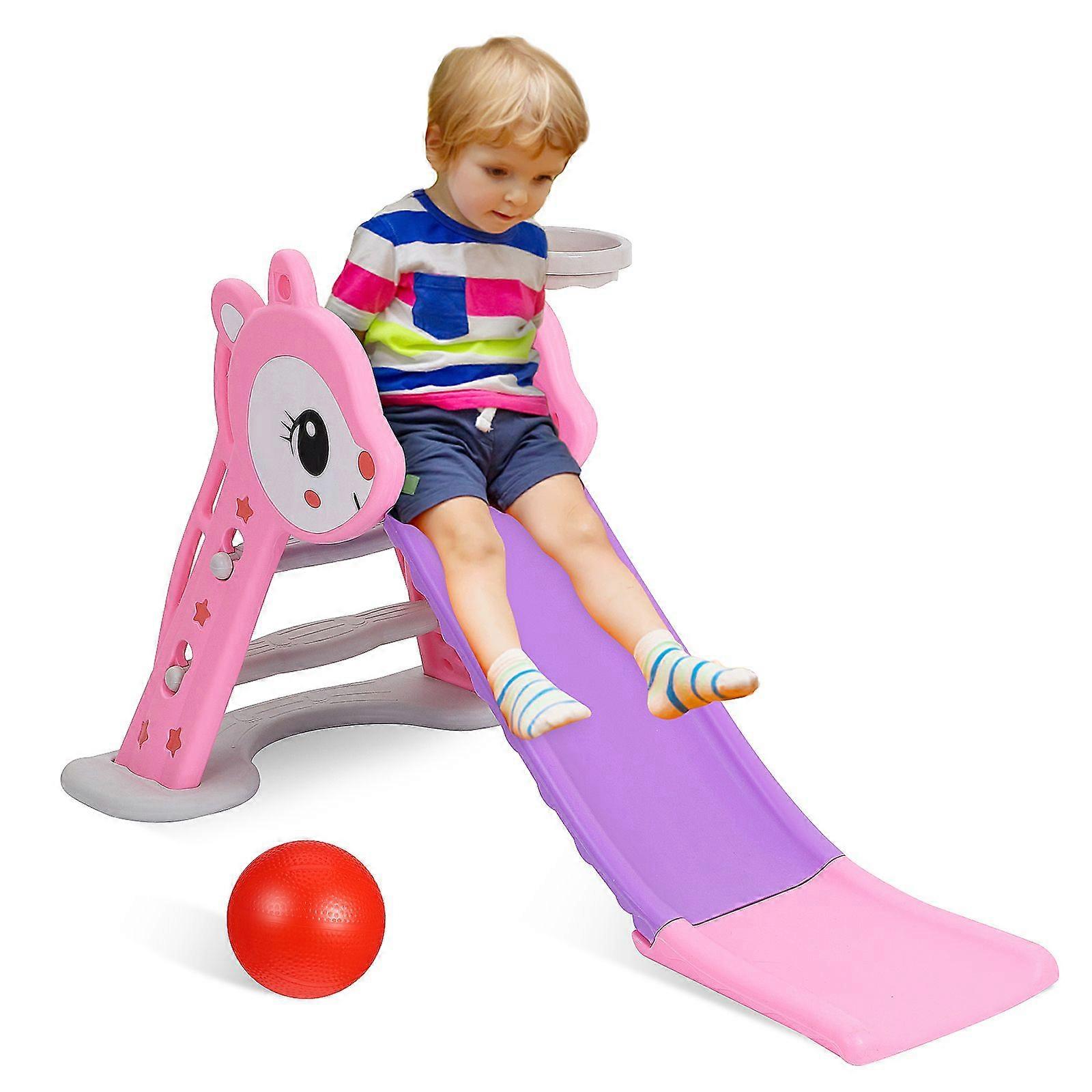 Description This indoor climbing slide for children features a slide and a basketball hoop with a ball, creating a mini playground experience. The plastic slide for kids is designed to provide endless fun and physical activity, helping kids develop their motor skills and coordination while enjoying a safe and engaging play environment. Features -Application: fit for child age 1-3 - Color: Pink -Material:Plastic - Size: 136.00X75.00X74.00cm/53.45X29.48X29.08in -Bright design: brightly colored toddler climber slide is designed to captivate children attention and bring joy to indoor or outdoor playtime -Gentle small slope: the kids slide features a smooth slope with easy to climb steps, ensuring a safe and enjoyable sliding experience for toddlers -Stable base: equipped with a sturdy base that can be filled with water or sand for added stability, making kids slide secure for active play -Basketball hoop: includes a detachable basketball hoop and ball, kids indoor slide is perfect for encouraging your little kids to move -Easy assembly: lightweight and simple to assemble, this playset can be conveniently moved around your home or yard for versatile usePackage list: 1 x Slide 1 x basketball frame 1 x basketball 1 x stable base