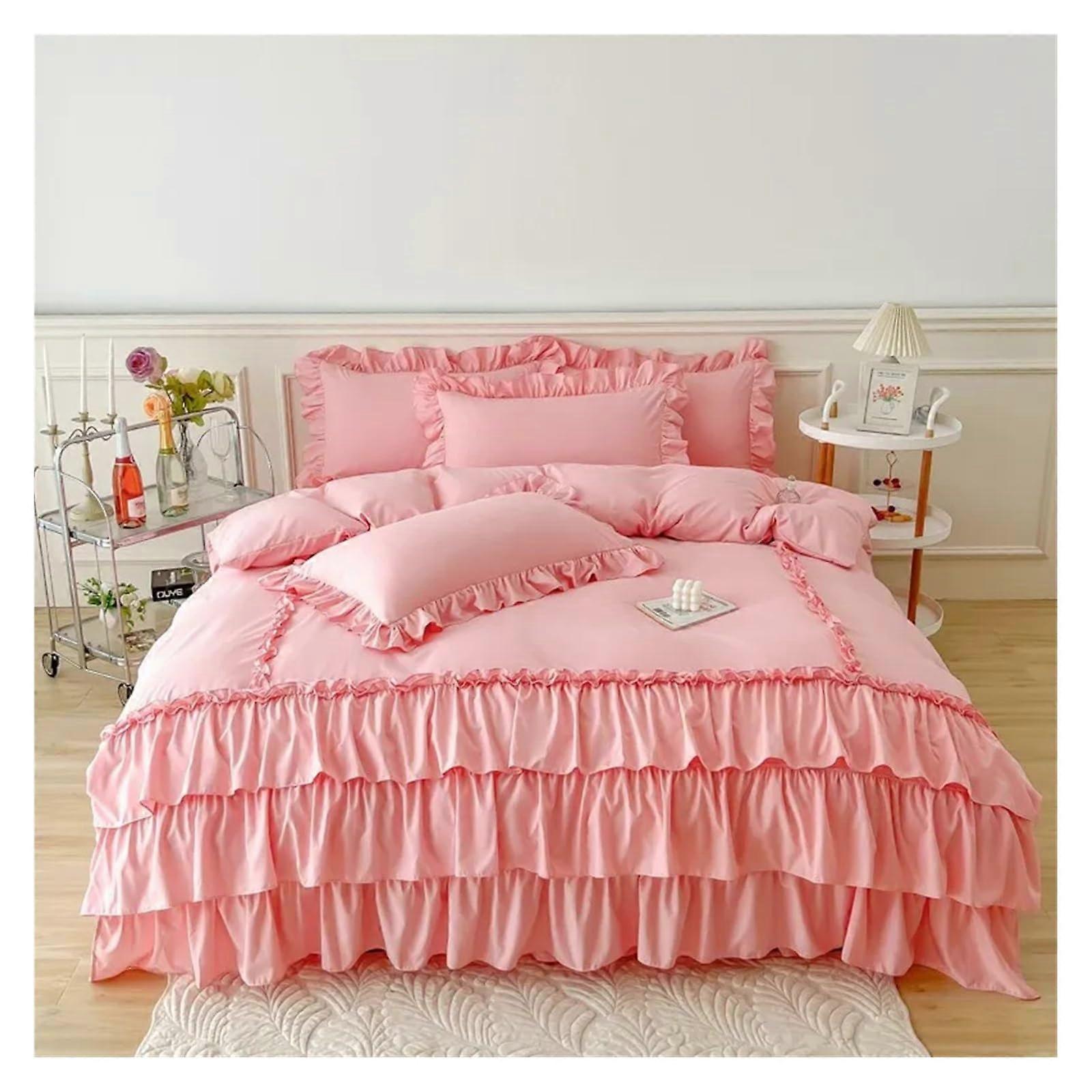 Four Piece Bedding Set Ruffle Duvet Cover Washed Microfiber Queen King Twin Shabby Chic Farmhouse Bianco Pink