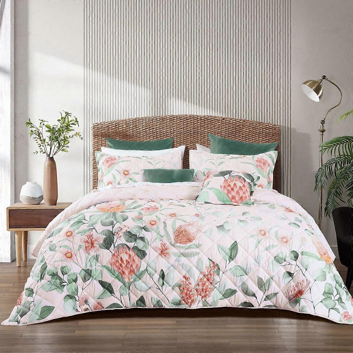 A Beautiful Arrangement Of Protea Flowers Is Positioned Perfectly Over The Blush Foreground. This On Trend Design Bianca Sidney Blush Printed Floral Bedspread Set Has Been Exclusively Hand Painted By One Of Our Australian Designers. Printed And Quilted On Super Soft Easy-Care Fabric This Design Is Finished With A Tailored Edge To Enhance The Overall Look Of This Design.