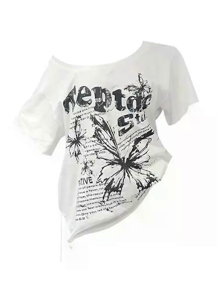 White 100% Cotton Y2k Vintage Oversize Off shoulder Short sleeve T shirt With Print Women Casual Summer Top Butterfly Tees