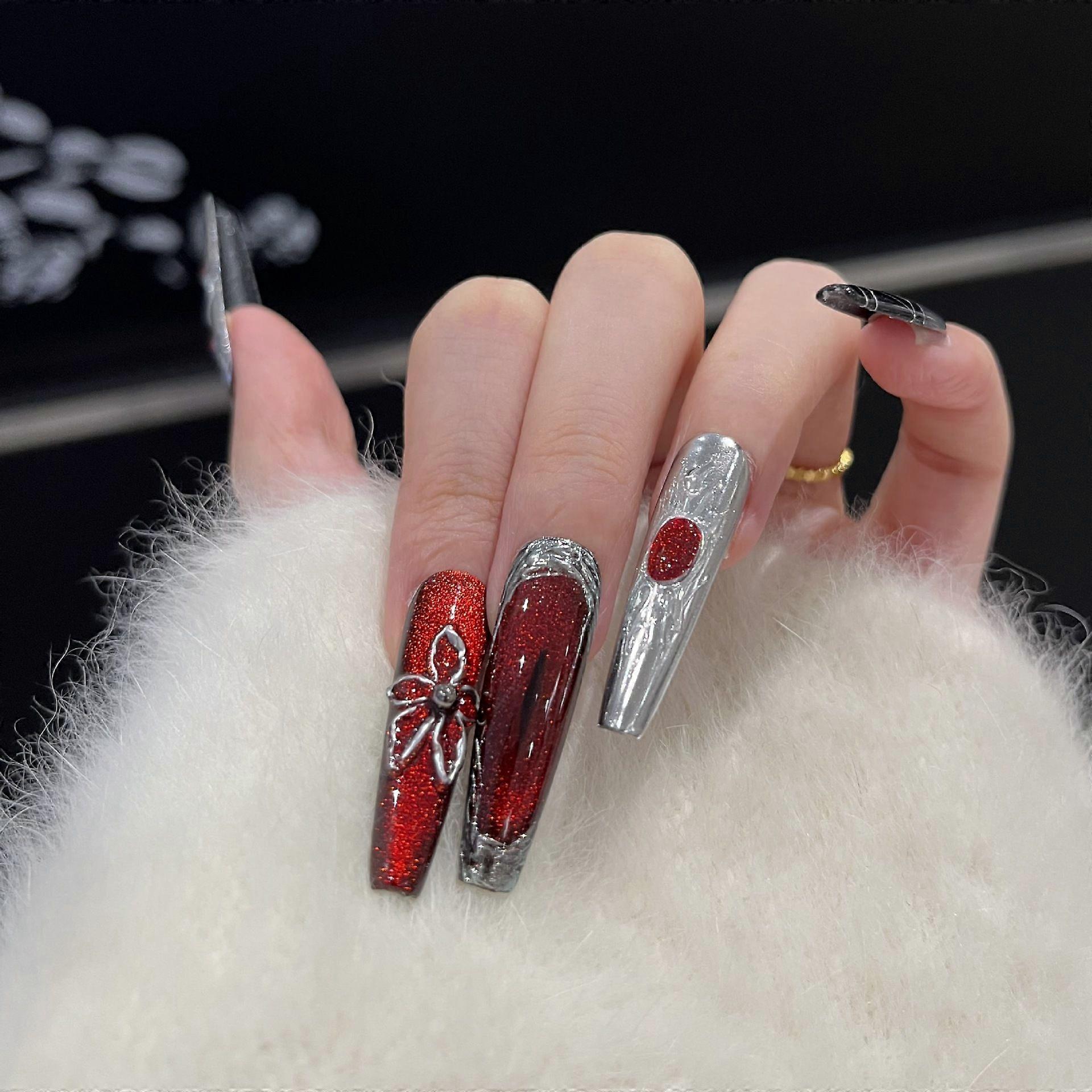 Mirror Glass Bead Cat Eye Nails Halloween Gothic Style Press On Nails Handmade