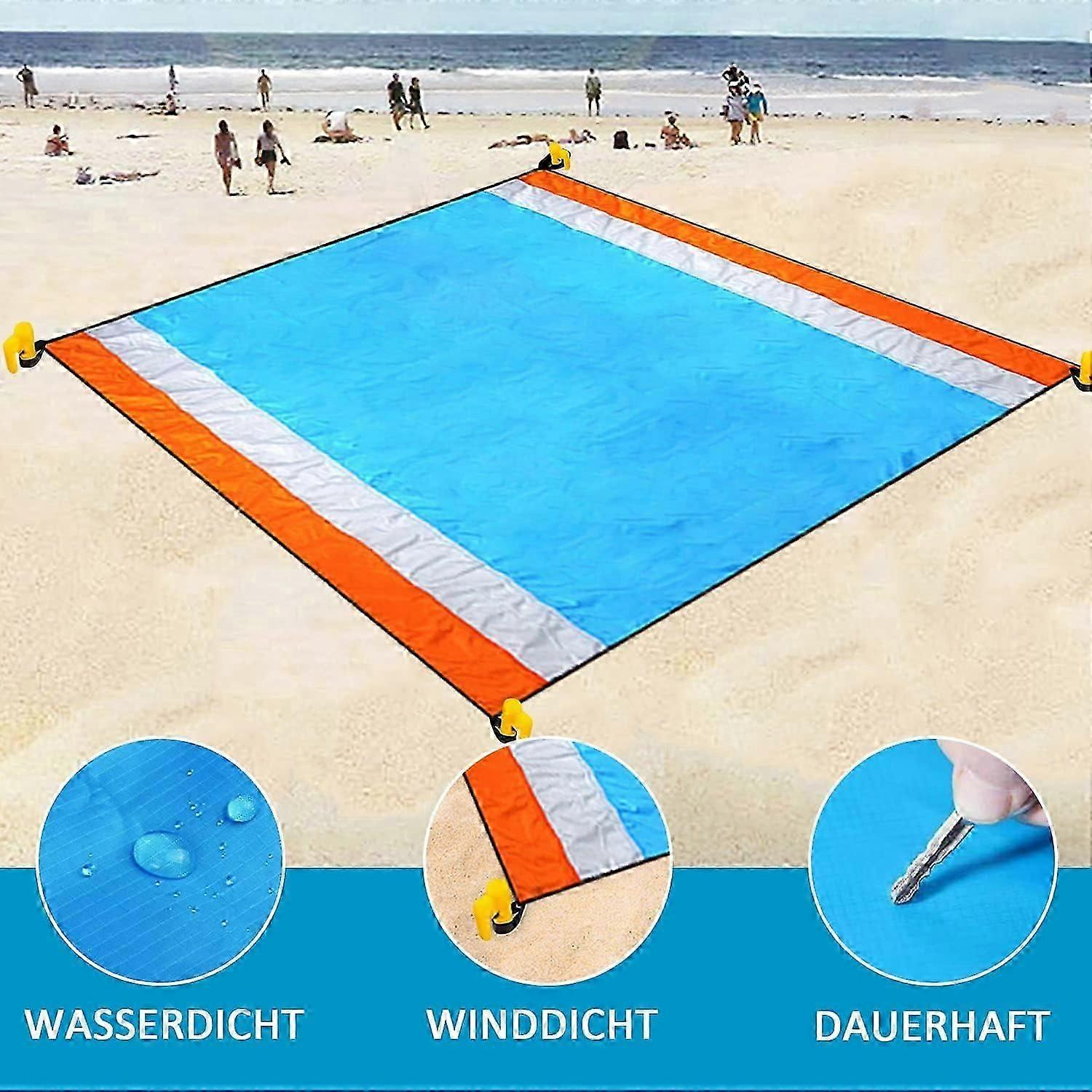 Extra Large Beach Blanket 210x200cmThe sand-free beach mat of 210m x 200cm offers enough space for 4-7 people. Folded size of the beach blanket of about 16cm x 13cm in a small bag, very light and portable for travel and camping. CompactWaterproof and sand-free beach blanketHUSTUNG beach blanket is absolutely sand-free and waterproof. Sand-free beach mat can effectively prevent sand from adsorbing on mat from below. The waterproof picnic blanket keeps you away from the wet and dirty ground. Washable, Lightweight and WindproofHigh-density, abrasion-resistant, lightweight and breathable 100% nylonOur beach blankets are lightweight, washable and easy to clean 4 solid plastic stakes can effectively prevent our picnic blanket from being blown away by the wind. beach mat will last for years. Multipurpose Outdoor Blanket Our beach blanket are designed for outdoor activities, also can be used as picnic blanket, tent mats etc. Our waterproof picnic blanket is great for beaches, picnics, parks, camping, hiking, fishing, other occasions and outdoor activities.