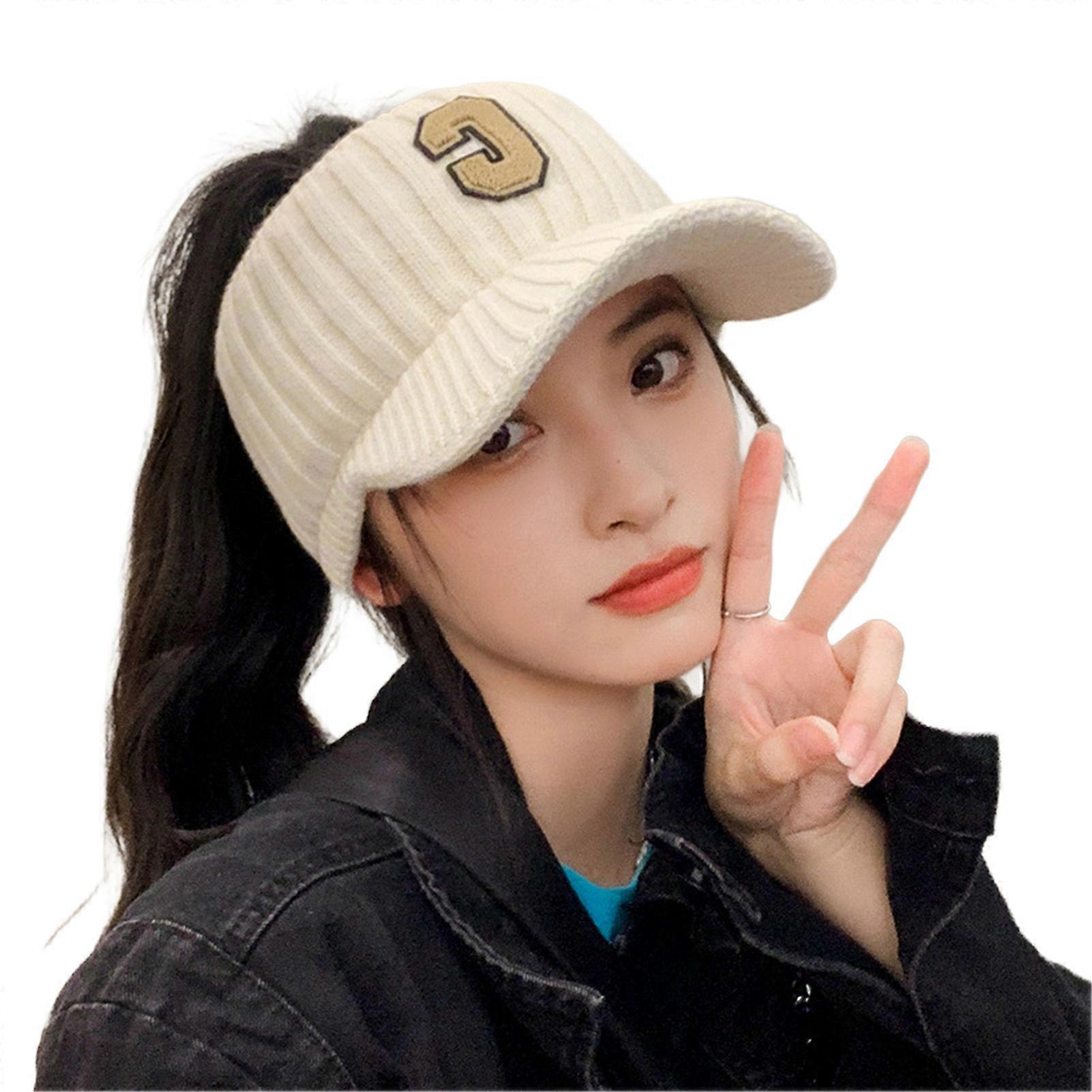 Women's Knit Visor Beanie Hat with Ponytail Hole Warm Winter Peaked Cap for