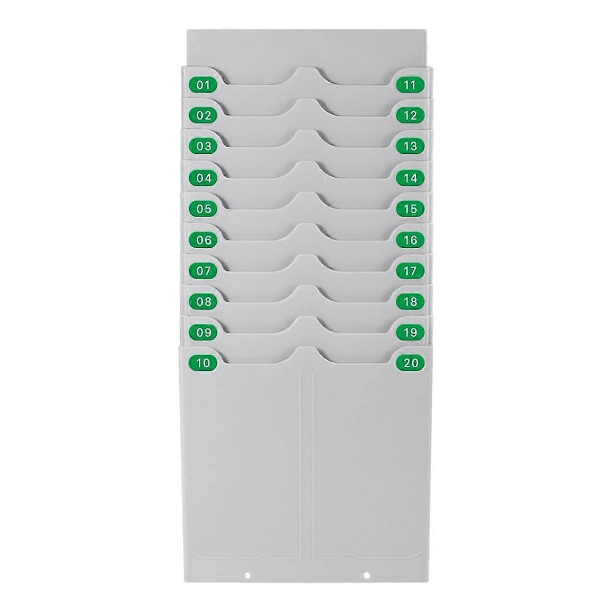 Large Capacity Time Card Holder - Holds 20 standard 3.4-inch wide cards. Easily keep physical records for each employee and maximize office efficiency. Convenient and Reliable - With its expandable modular design, pockets can be added or removed to suit your needs. This time card holder is simple and straightforward to use and easy to store. Materials - Made of and plastic. Rust-free and impact-, ensuring is lost in a disaster. Great for indoor and outdoor use. Easy Installation - Comes with mounting hardware. Install this card holder near the clock or employee entrance for easy use. Note: Time cards are not included. [Wide Application]: The time card holder is suitable for office, factory, warehouse workshop clocking in, etc., convenient for recording attendance time, attendance, payroll, employee assignments indoors and outdoors. Colour:Gray Material:Plastic Package Contents: 1 * 20 Slots Rack Card Only the above package content, other products are not included. Note: Light reflection and different displays may cause the color of the item in the picture a little different from the real thing. The measurement allowed error is +/- 1-3cm.