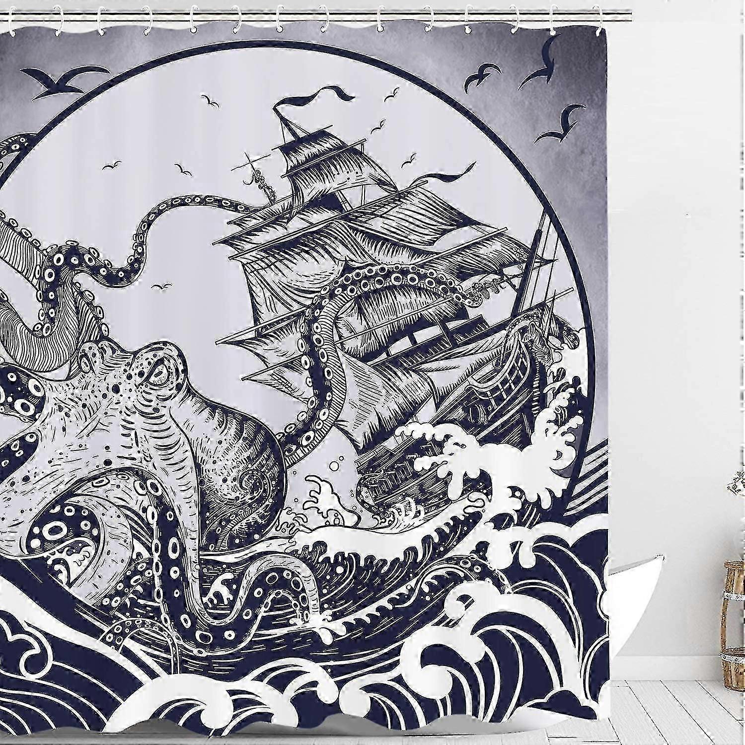 Nautical Octopus Shower Curtain in Black - AMM Fabric Design for UK Bathrooms, Size 72x72 Inches