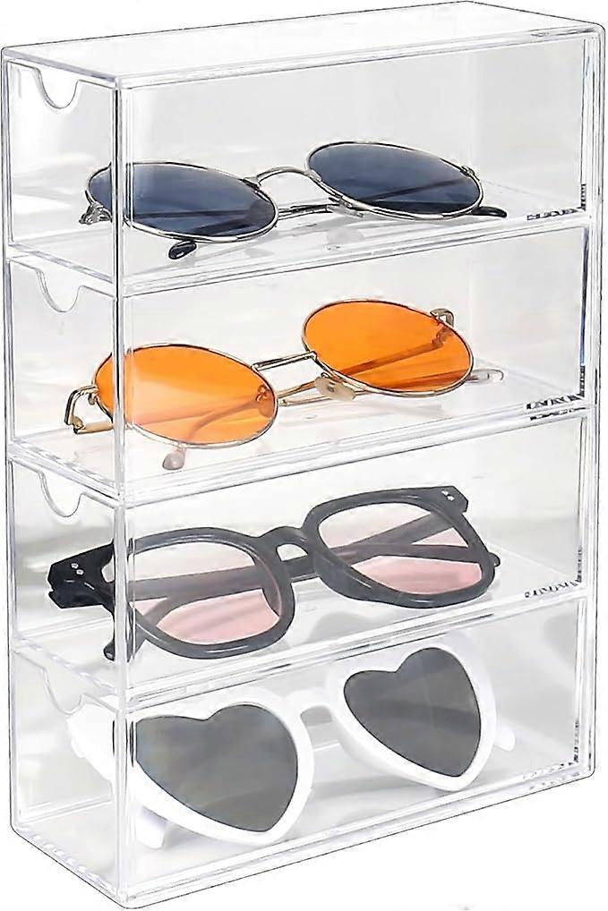 【Practical Glasses Storage】 This storage box is perfect for storing glasses of all kinds thanks to its 4 pull-out drawers. By dividing into several compartments per drawer, your glasses are stored safely and without scratches. Modern and elegant design is very suitable for benches, cabinets, cupboards. 【Plenty of space】The sunglasses storage holder is 24.5 x 17.5 x 6.5 cm (L x W x H), which takes up minimal space on the table and saves space on the desk, glasses organizer space for multiple glasses, small and large cosmetic items or other items for daily use. We offer intelligent storage solutions for your home, including closets, basements, offices and in other homesresidenceresidenceresidenceDiameter: 【Durable material】The acrylic glasses organizer is made of sturdy, transparent plastic and processed with high quality. Glasses organizer with transparent design. so you can always grab the contents at a glance, no more digging in drawers to find what you need. The minimalist design is paired with a sleek look that easily blends into any room. 【Easy to Use】The display box can be stacked or used side by side according to your needs. By using this glass storage box vertically or horizontally, you can create a custom storage solution that works for it, simply flip the boxes; It is small and compact, saves space on your desk, and the box design makes it easy to access and easy to open. 【Versatile Use】Made of acrylic, has 4 separate boxes for multiple pairs of sunglasses, which can store and display sunglasses, glasses, eyeglasses, watches, jewelry, cosmetics, accessories, etc. The box is also perfect as a bathroom shelf, sorting box for storing cosmetics, makeup storage, nail polish storage and more. Maybe you can use it to create a dressing table or a makeup case.