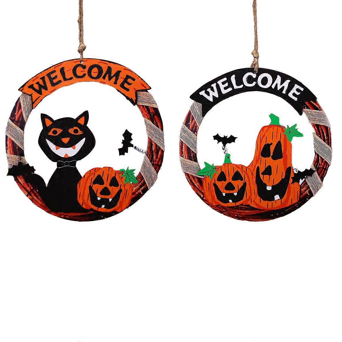 Halloween welcome sign, hanging wreath with pumpkins and bats, 17cm 2pcs sign decorative halloween wood