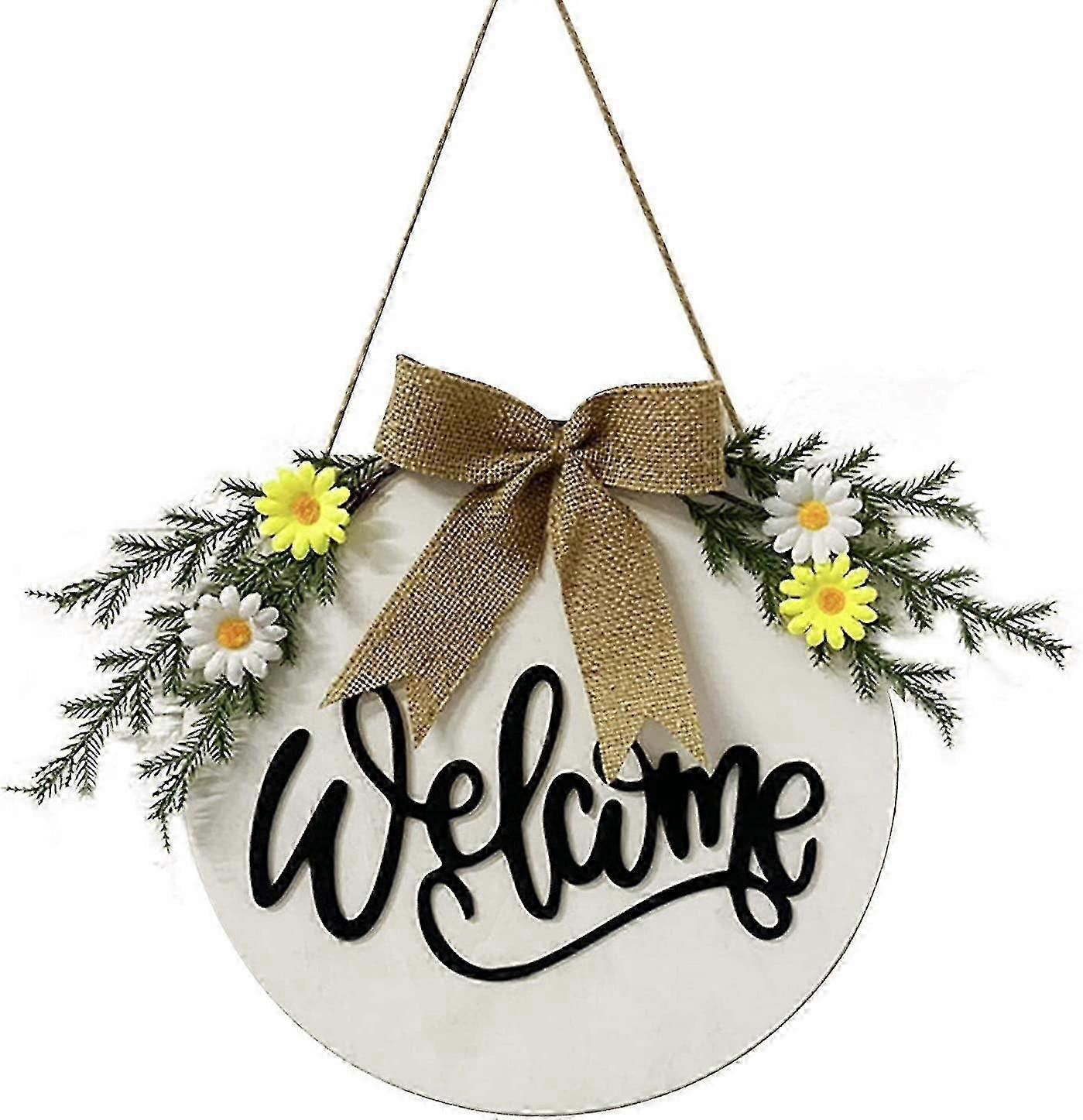 Round Wooden Welcome Sign Adorned with Artificial Green Daisies for Front Door and Bar Decor