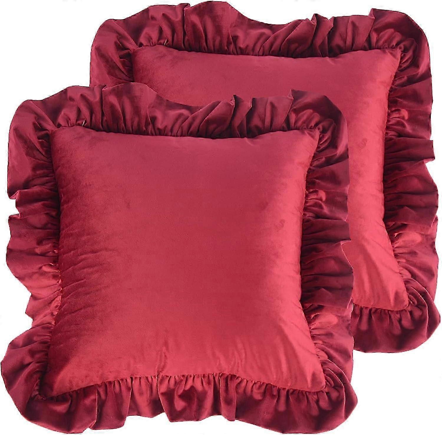 Shabby Chic Velvet Cushion Cover Set of 2 in Burgundy Red with Ruffles, 50x50cm UK Sofa Decoration