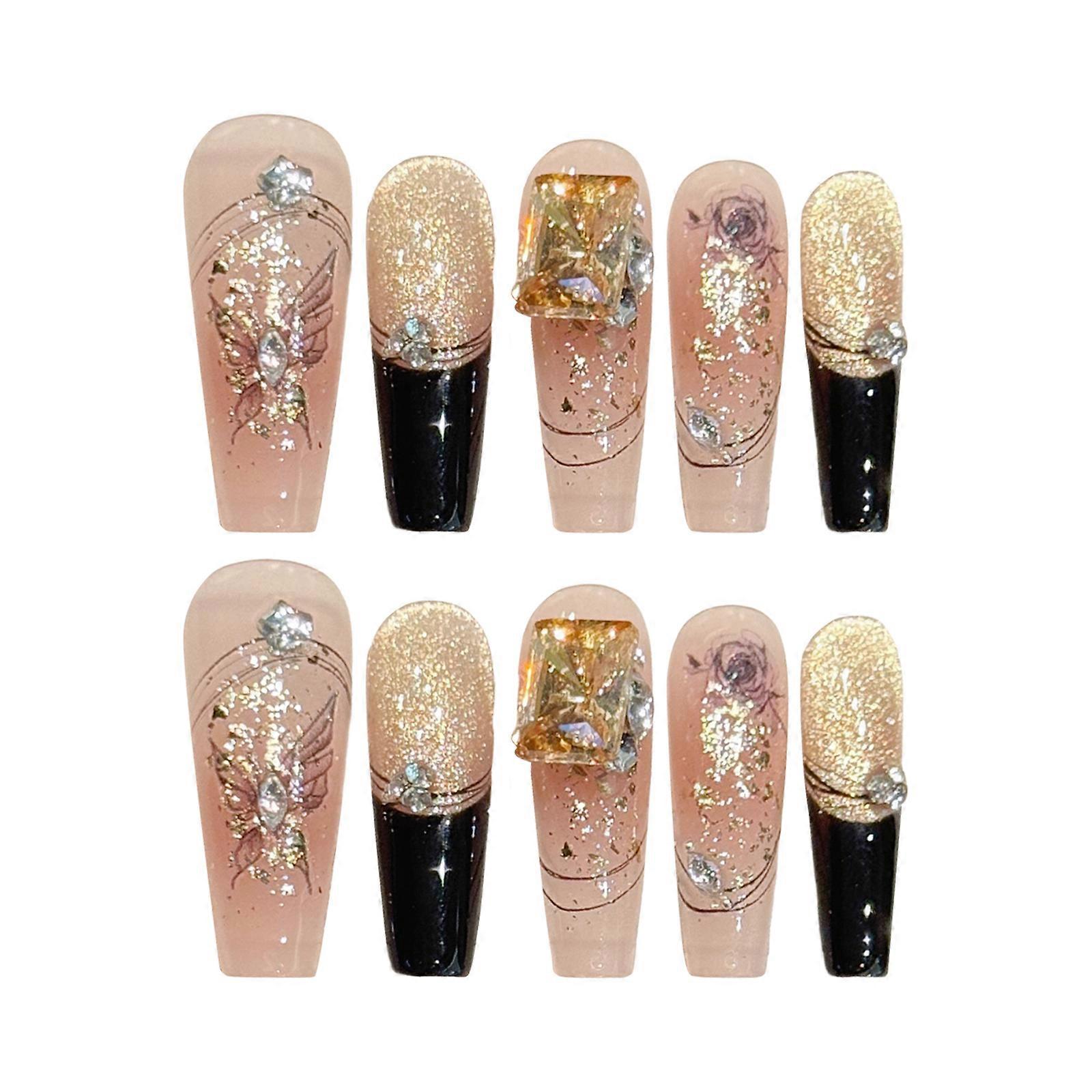 Black French Cat Eye False Nails with Gold Edge Amber 10PCS Glitter Press on