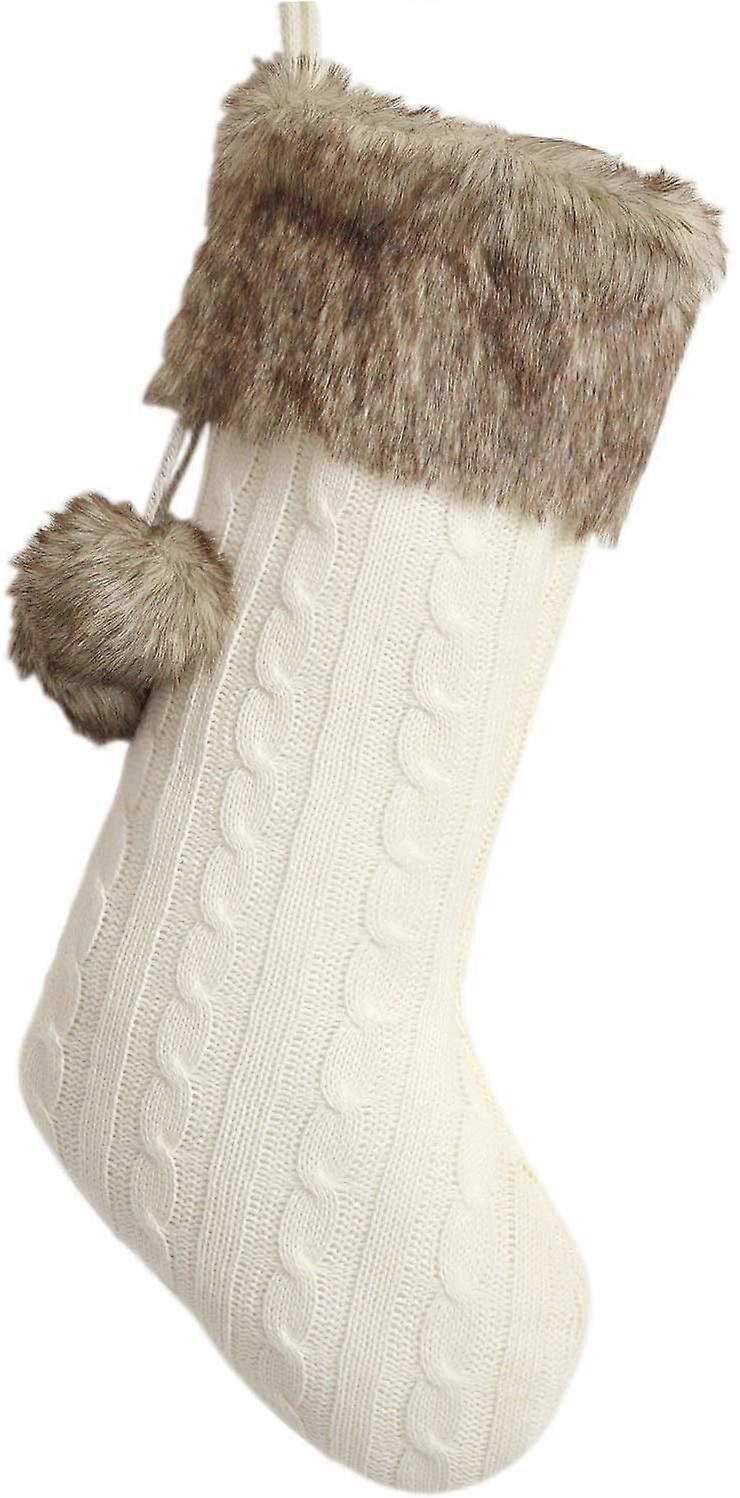 Ivory Cable Knitted Body, Fur with Fur Fluffy Pompom Ball Christmas Stocking, Xmas Tree Decoration Festival Party Ornament - 0"x8"