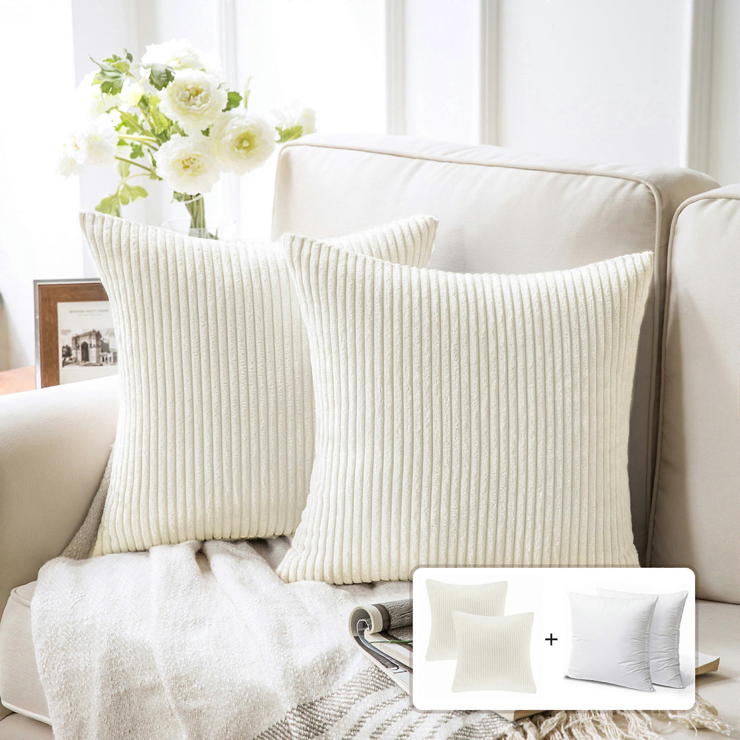 Fluffy Corduroy Velvet Solid Color Suqare Cusion Accent Decorative Throw Pillow for Couch, 20" x 20", Off White, 2 Pack