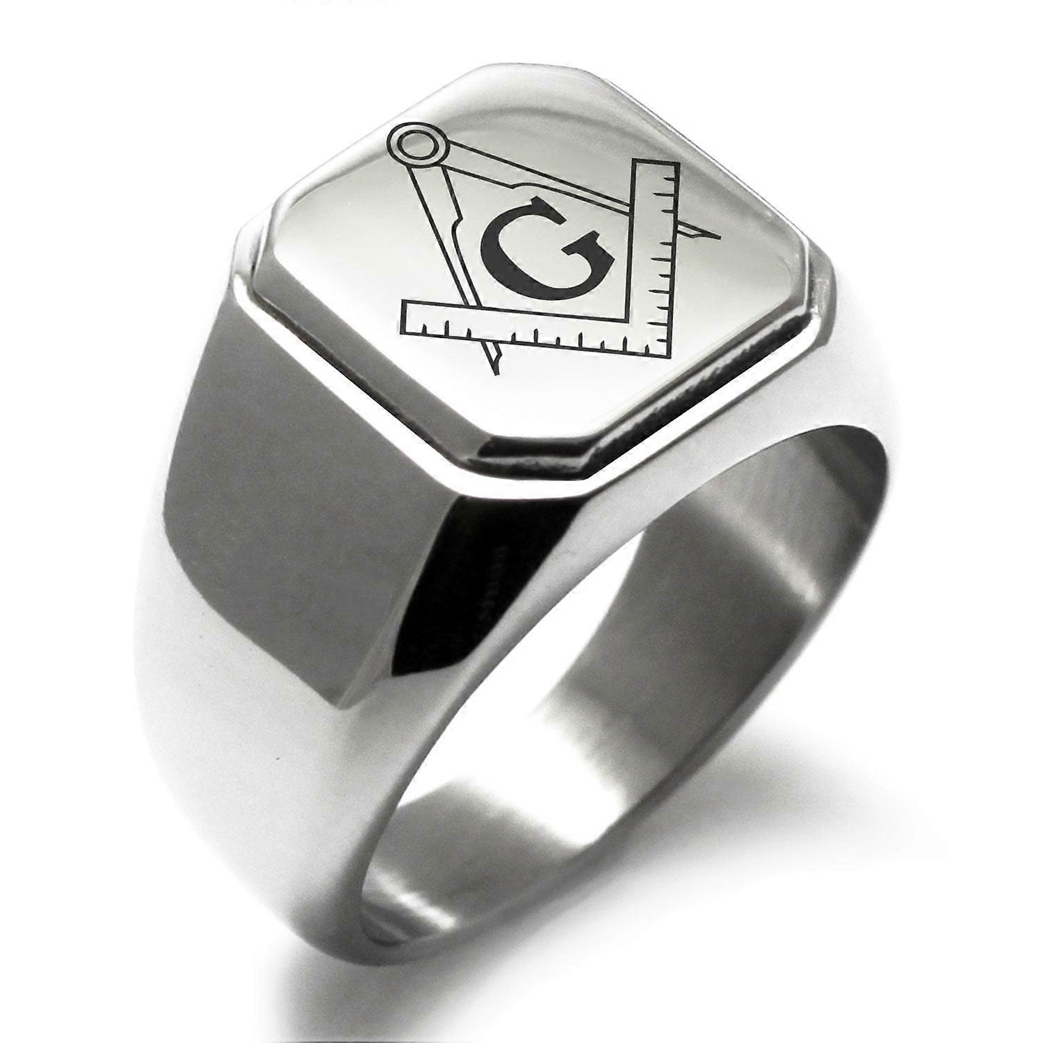 Tioneer Stainless Steel Freemasons Masonic Compass Engraved Square Flat Top Biker Style Polished Signet Ring