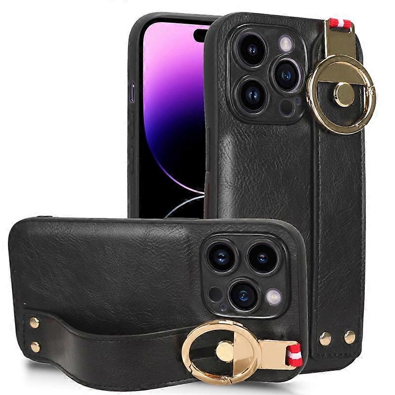 Luxury leather case for compatible with iPhone 15 Plus, adjustable wristband, kickstand, protective bumper, hand holder, for men, women, girls