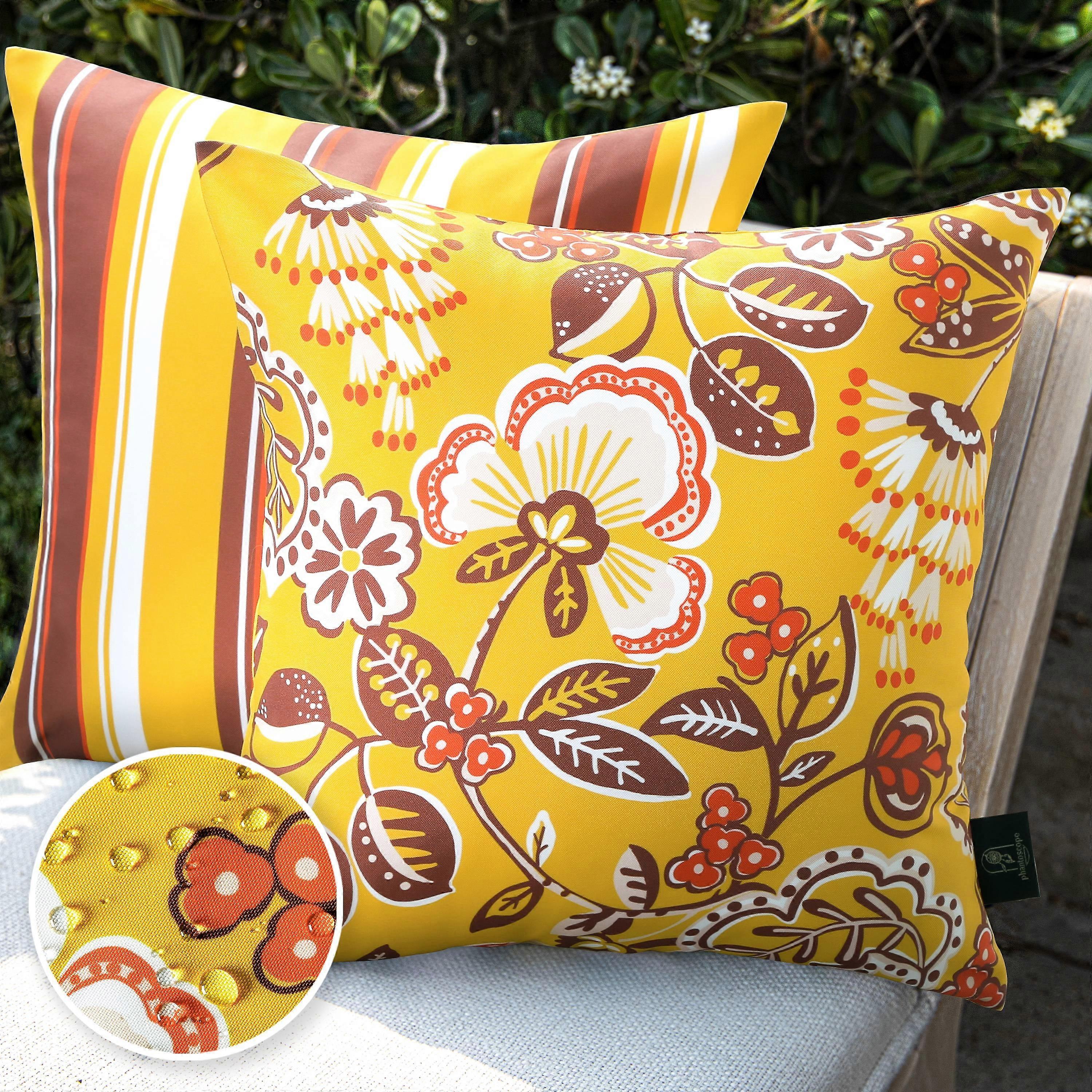 Phantoscope Outdoor Waterproof Floral Printed Decorative Throw Pillow Cover for Patio Garden, Yellow 20x20 Inch, Pack of 2