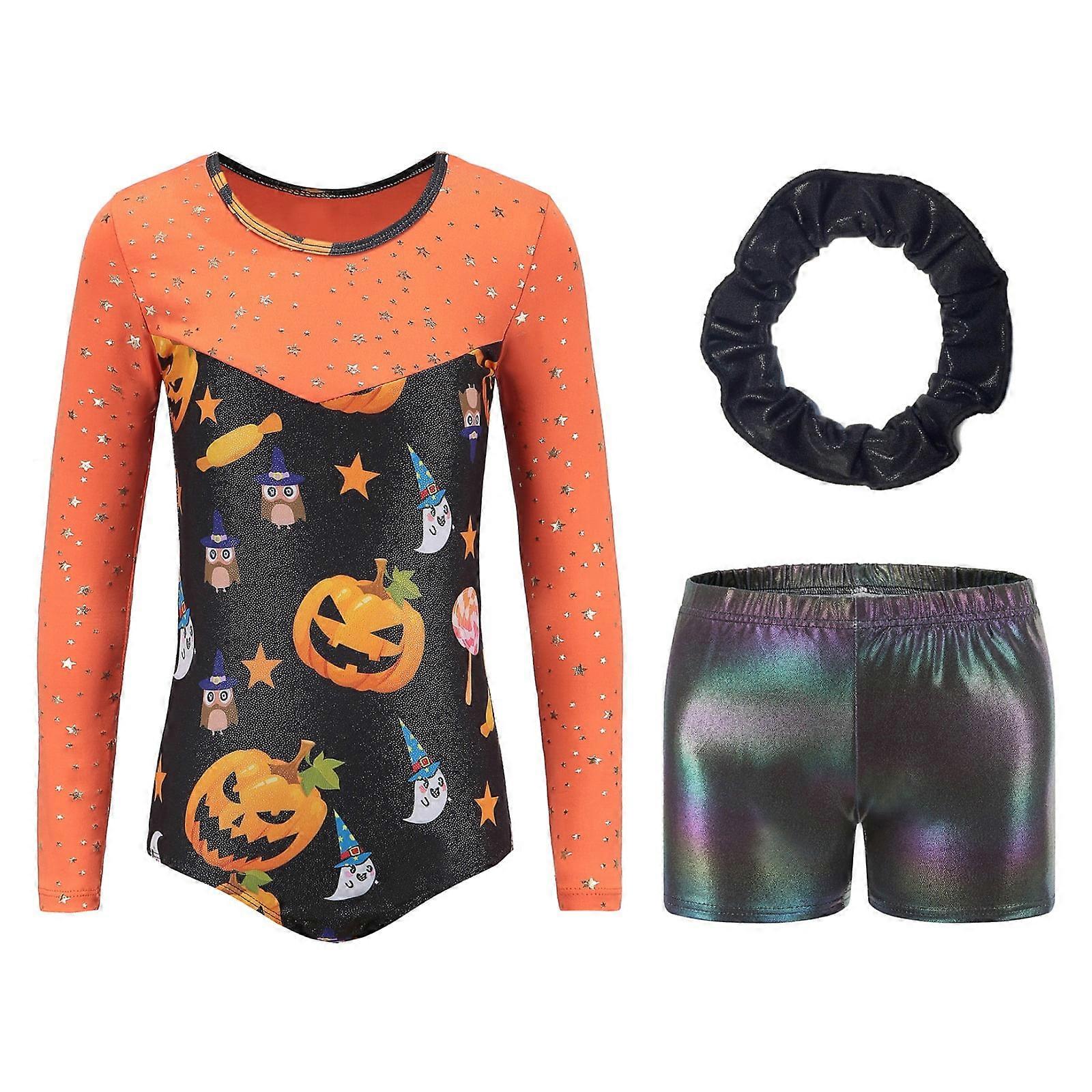 Crowdstage Gymnastic Leotards for Girl Long Sleeve Halloween Pumpkin Set of 3 One-Piece Dance Outfit+shorts+headband