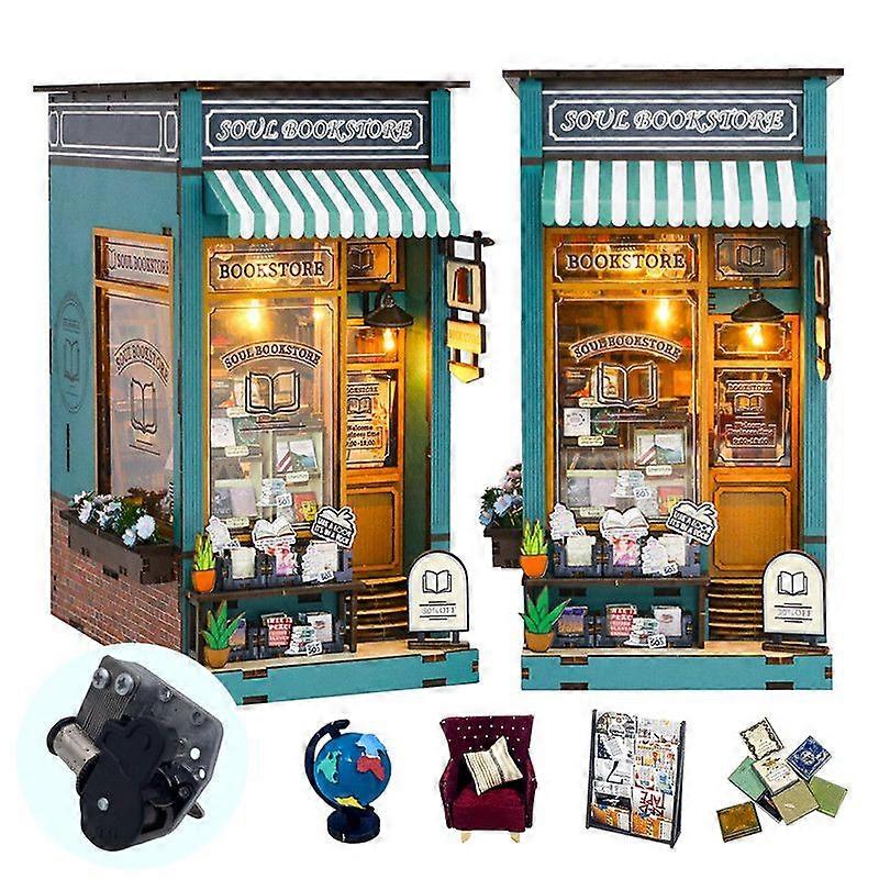 [ Leisure Time ] On a rainy night, you hurriedly passed by the street corner, but suddenly stopped and turned to look at a bookstore. The warm light shone through the window, and elegant music slowly drifted out. In that moment, you were enchanted, as if forgetting all your worries, and you stepped into this soulful bookstore... This book nook kit is perfect for adults or teens aged 14 and up. The colorful manual will easily guide you through this leisurely journey, which takes about 7 hours. [ Delightful Details ] This book nook kit for adults is filled with delightful details. You won't have to pay extra - we'll include a music box for free. Simply turn the handle and you will be surrounded by the sounds of a fairy tale. It also comes with four LED lights that can be controlled by a touch switch. With just a gentle touch, the warm glow of the light will help chase away all your worries. [ Exquisite Handicraft ] It's a book accessory that can add a touch of elegance to your bookshelf. It's a miniature dollhouse kit that fits correctly on any bookcase. It can also function as a charming night light and play music like a music box. Assembling this 3D puzzle for adults will bring you joy and satisfaction. Create your dream little bookstore or mini library, complete with adorable mini furnitures. After finishing this miniature building, you may find yourself fantasizing about relaxing on the sofa with a good book or enjoying a cup of coffee on a sunny day. [ Creative Gift ] No one could resist this creative and wonderful gift. This diy miniature house kit is beautifully packaged in a colored box. Say goodbye to the stress of choosing a gift - this craft for adults is perfect for family, friends, lover or your special someone as a birthday, Valentine's Day, party, or holiday present. And if your hobby is crafts, it's the ultimate treat for yourself!