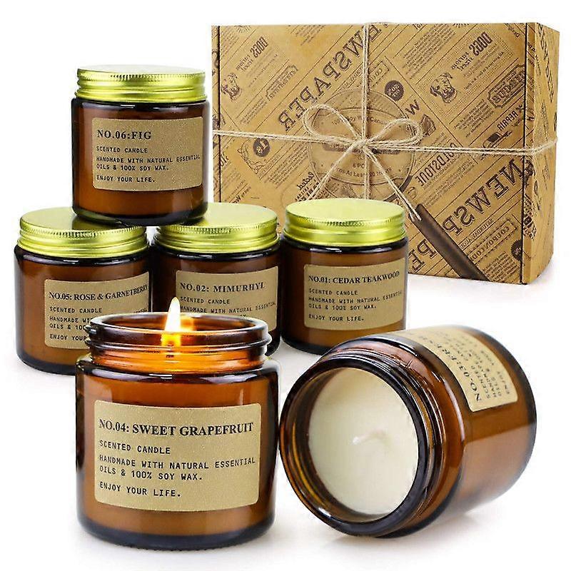 6 pack 3.5 oz amber jar candles in a vintage gift box, MIMURHYL, FRESH ROSE, CEDAR TEAKWOOD, SWEET GRAPEFRUIT, ROSE&GARNETBERRY, and FIG. Made from premium soy wax and 8% premium oils without bad ingredients. Equipped with the cotton wick minimize soot and irregular lump. Each candle weighs 3.5 oz (L 2.4 inches x H 2.5 inches), approximately 20 to 25 hours using time, 6 candles totally 120 to 150 hours. Soy wax candles are more practical, because they normally lasts around 20% slower than general candles. Nondisposable Inner and Outer Packing. Not only we adopt soy wax on candles, but also we use Nondisposable outer and inner packaging. External kraft paper and amber glass jars are practical, you are able to use them as home decoration.