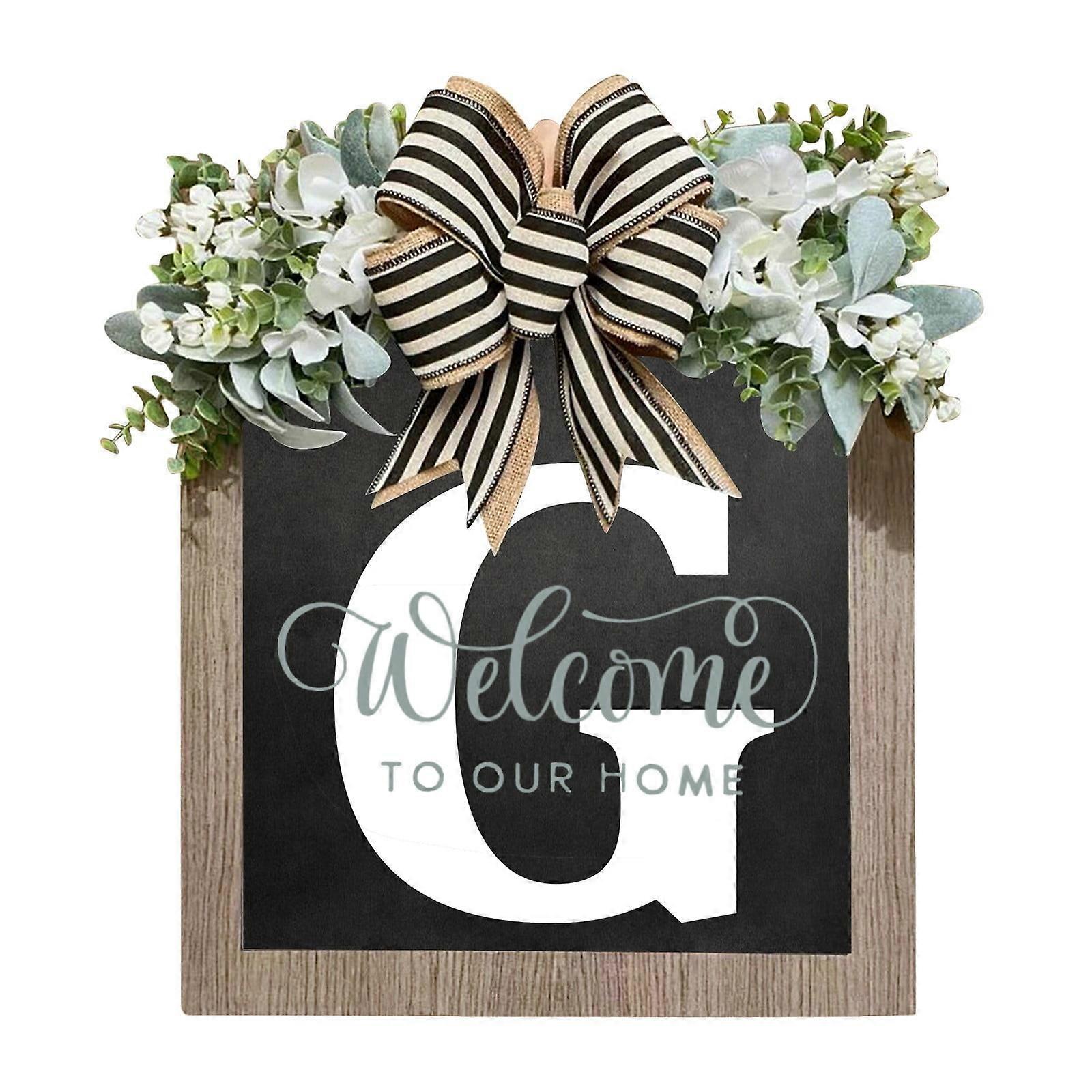 ionze Round Front Door Wreath with English Letters Welcome Sign Wreath with Bow Wreaths Front Door Outside Hanging Decor (BK)