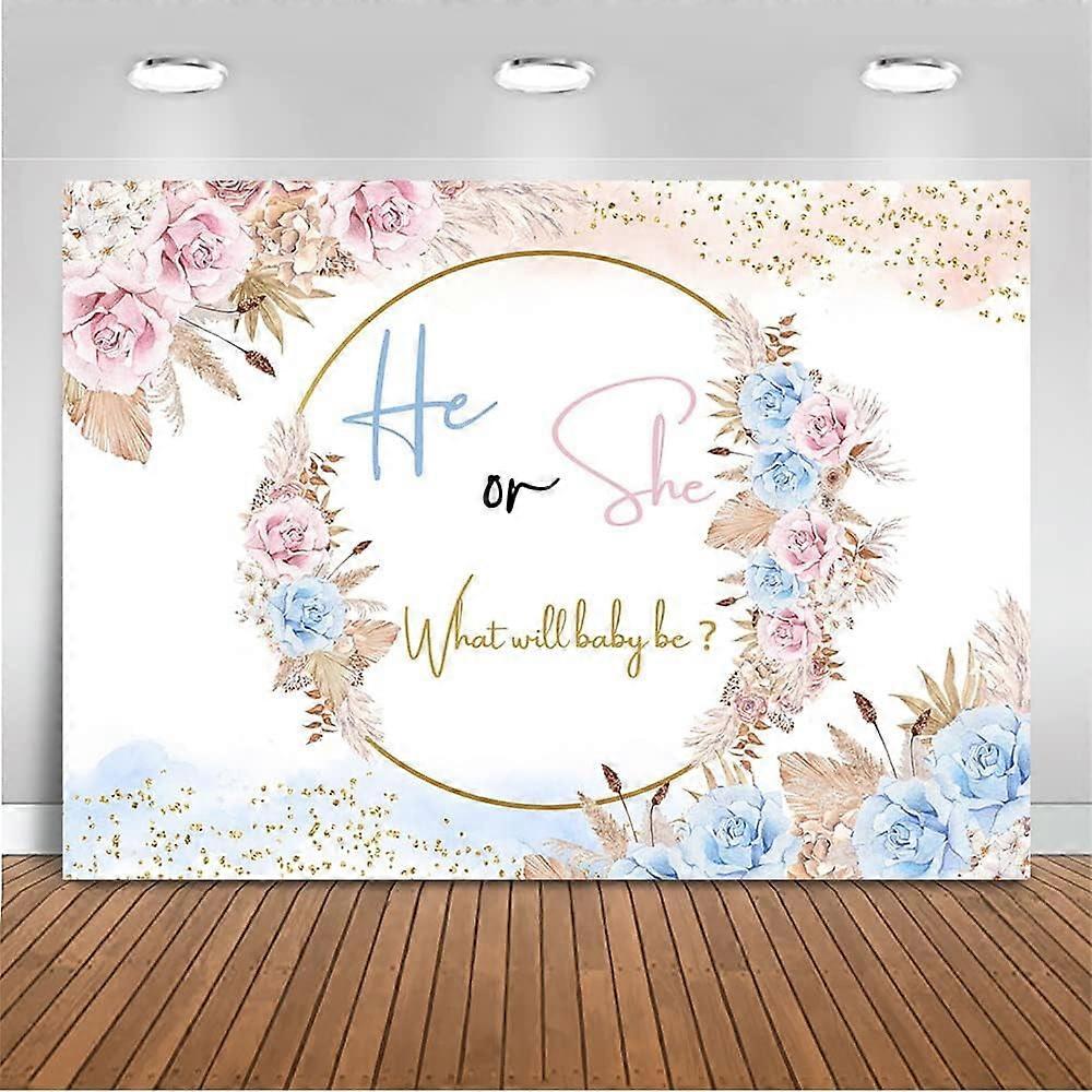 Boho Gender Reveal Backdrop 5x3ft, Pink or Blue Pampas Grass Party Decor, Compatible with He or She Tropical Aloha Cake Table Banner