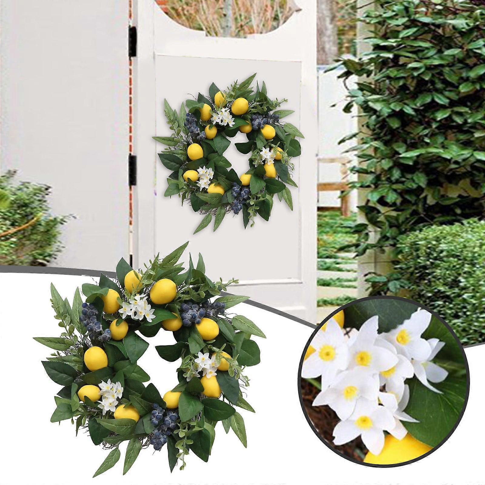 Zgyau Wreath Spring Lemon Wreath For Front Door Artificial Wreath With Lemons Blueberries Green Leaves For Summer Farmhouse Home Decor