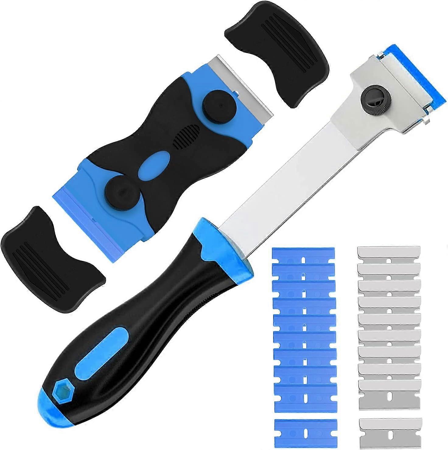 Glass Scraper & Long Handle Scraper, 2Pcs Razor Blade Tools with 10 Metal + 10 Plastic Blades for Windows, Stickers, Paint, Cooktop