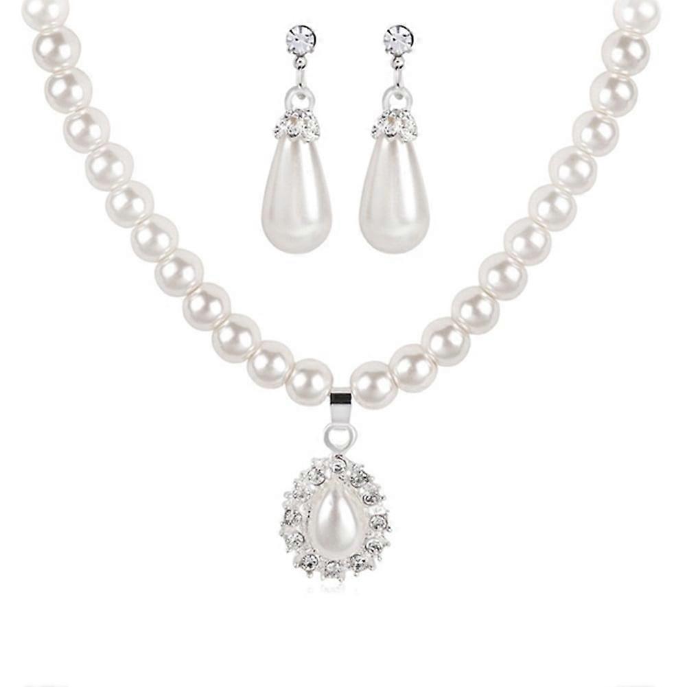 LEAQU Adult Women Jewelry Water Drop Faux Pearl Beaded Rhinestone Bridal Necklace Earrings Jewelry Set