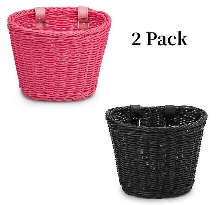 HIPKZ 2pcs 8.27x6.3x6.3in Bicycle Front Basket, Rattan Hand Woven, Waterproof, Adjustable, Retro Style, Compatible with Kids' Bikes (Pink & Black)