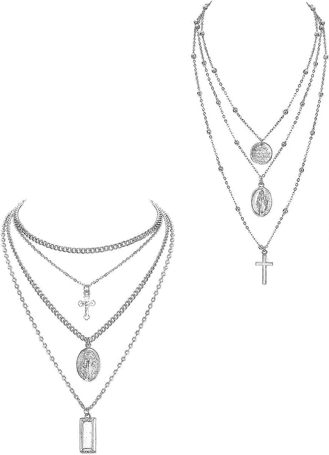 Jstyle 2PCS Layered Choker Necklaces for Women Tag Coin Cross Crucifix Blessed Virgin Mary Pendant Necklace Chain Silver Tone Gold Tone