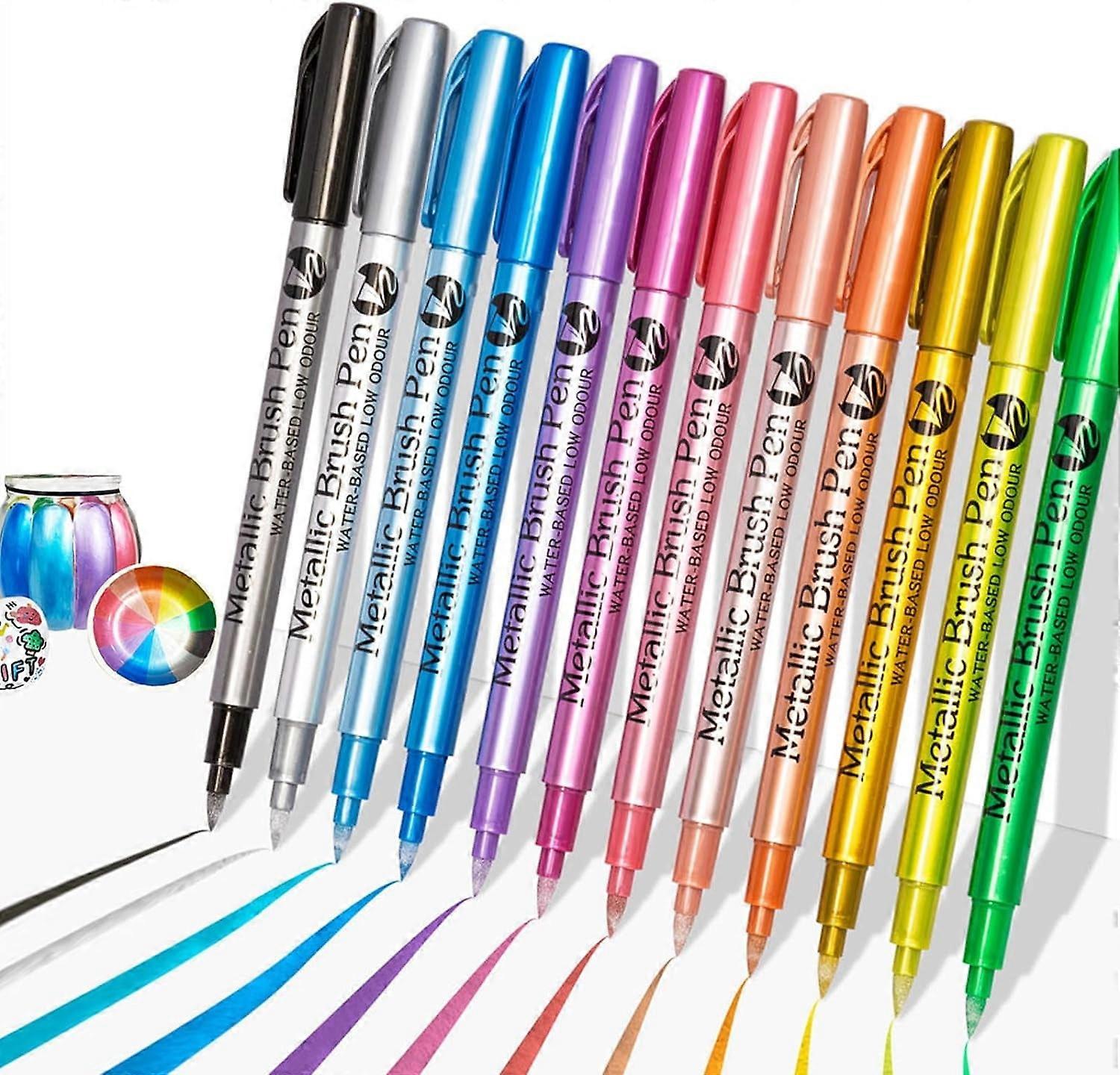 KsopiaVobs Acrylic Paint Markers, 12 Color Set with Metal Brush Tip, Compatible with Rock, Canvas, Wood, Ceramic, Glass, Stone, Fabric & DIY Crafts