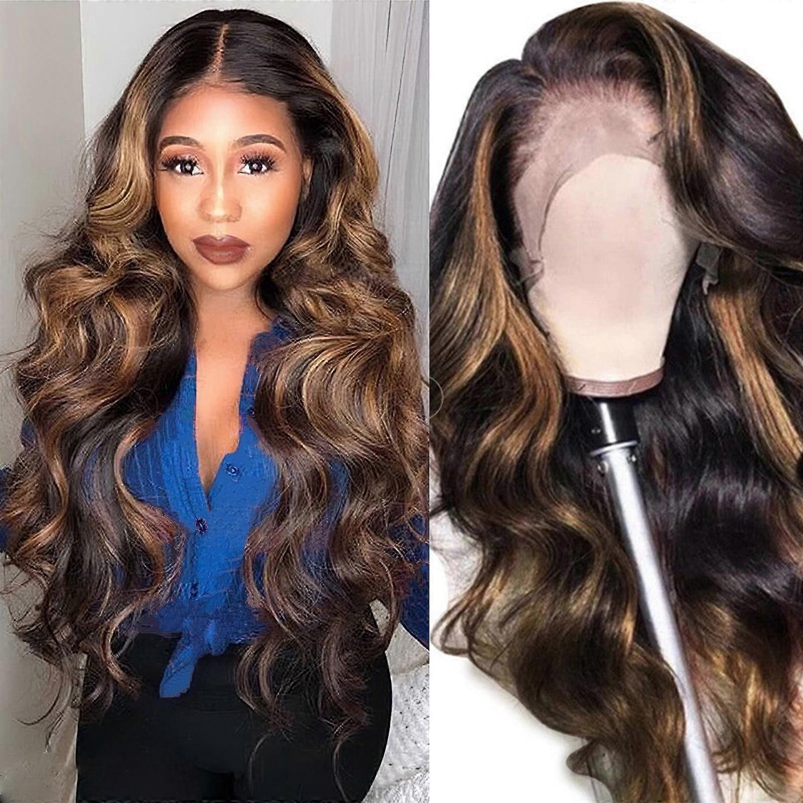 Long Brown Highlight Wavy Wig for Women, Middle Part Lace Front Curly Wavy Synthetic Hair, Brown Mix Blonde Heat Resistant Fiber Full Wig